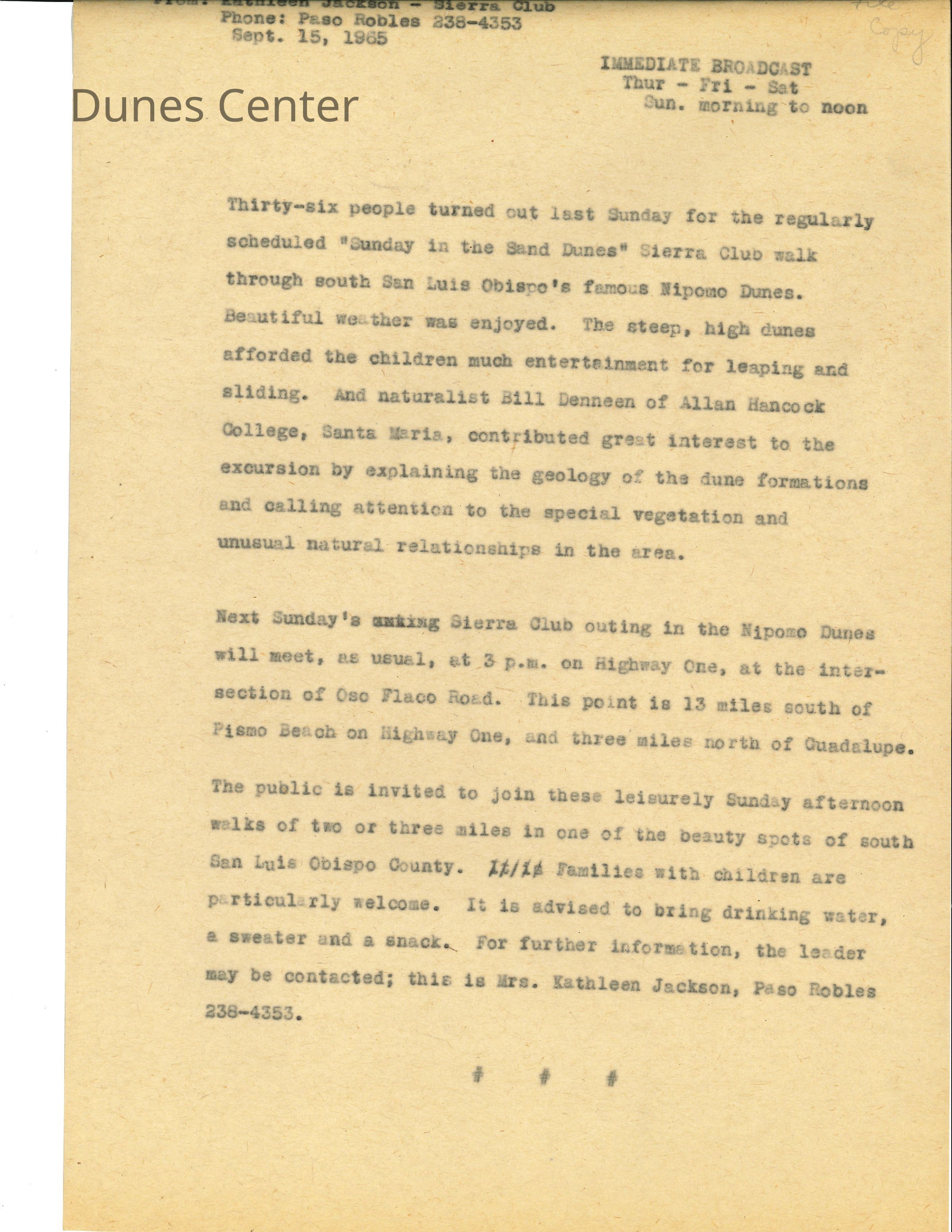 September 15, 1965, Press release from Kathleen Goddard-Jones about upcoming outings in the dunes.
