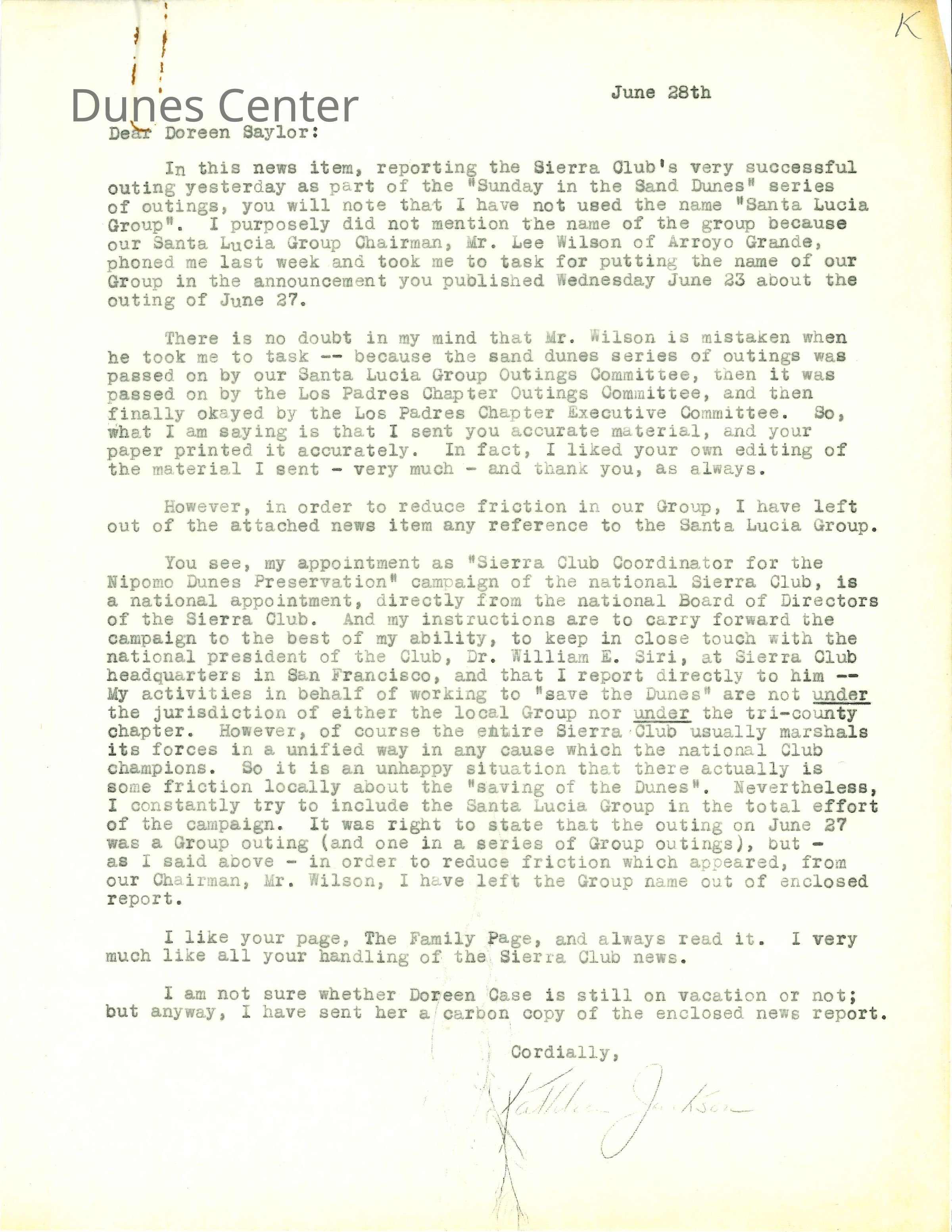 June 28, 1965, Press release from Kathleen Goddard-Jones about upcoming outings in the dunes, includes attached letter about Sierra Club issues.Collection