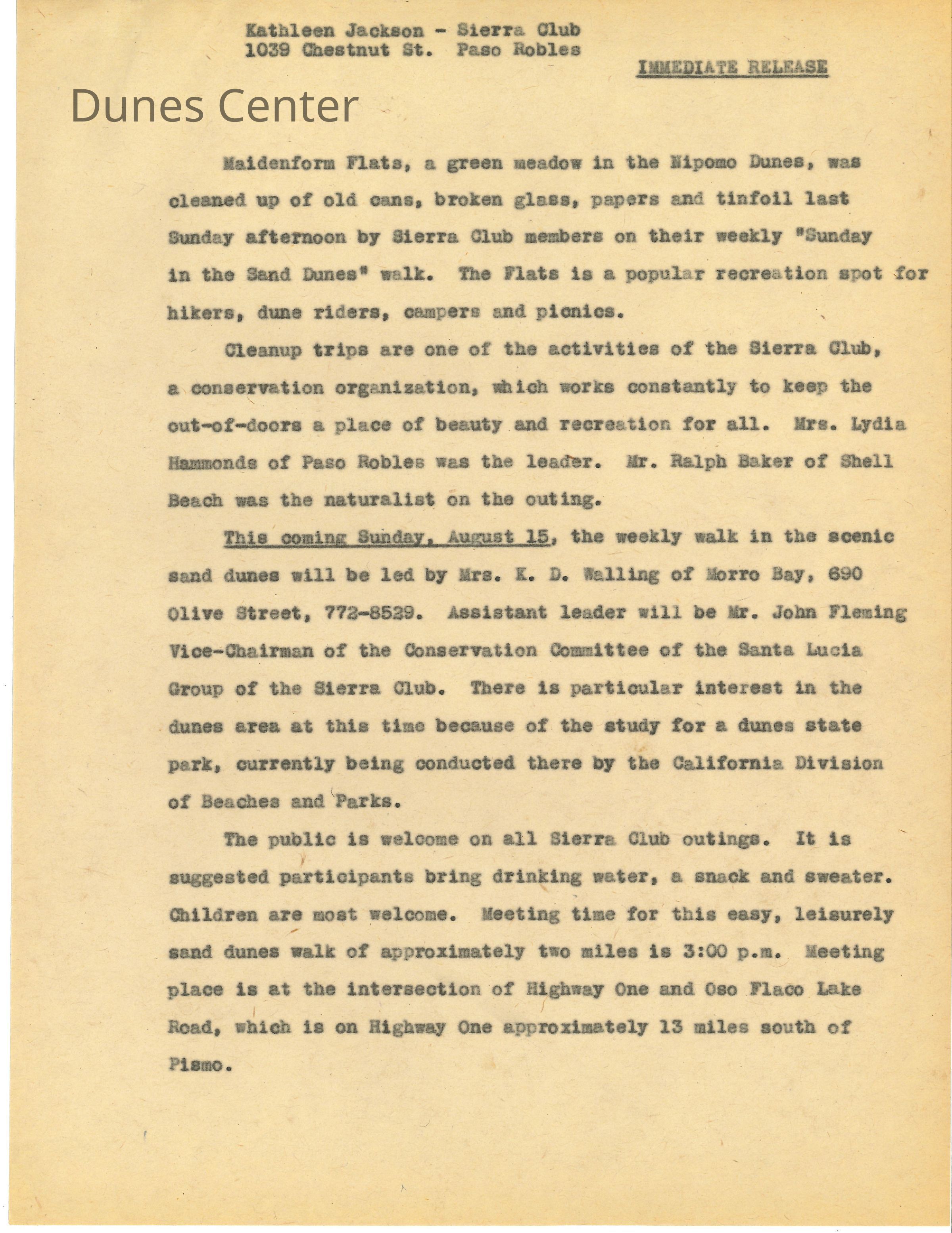 August, 1965, Press release from Kathleen Goddard-Jones about upcoming outings in the dunes and a successful cleanup trip at Maidenform Flats.Collection