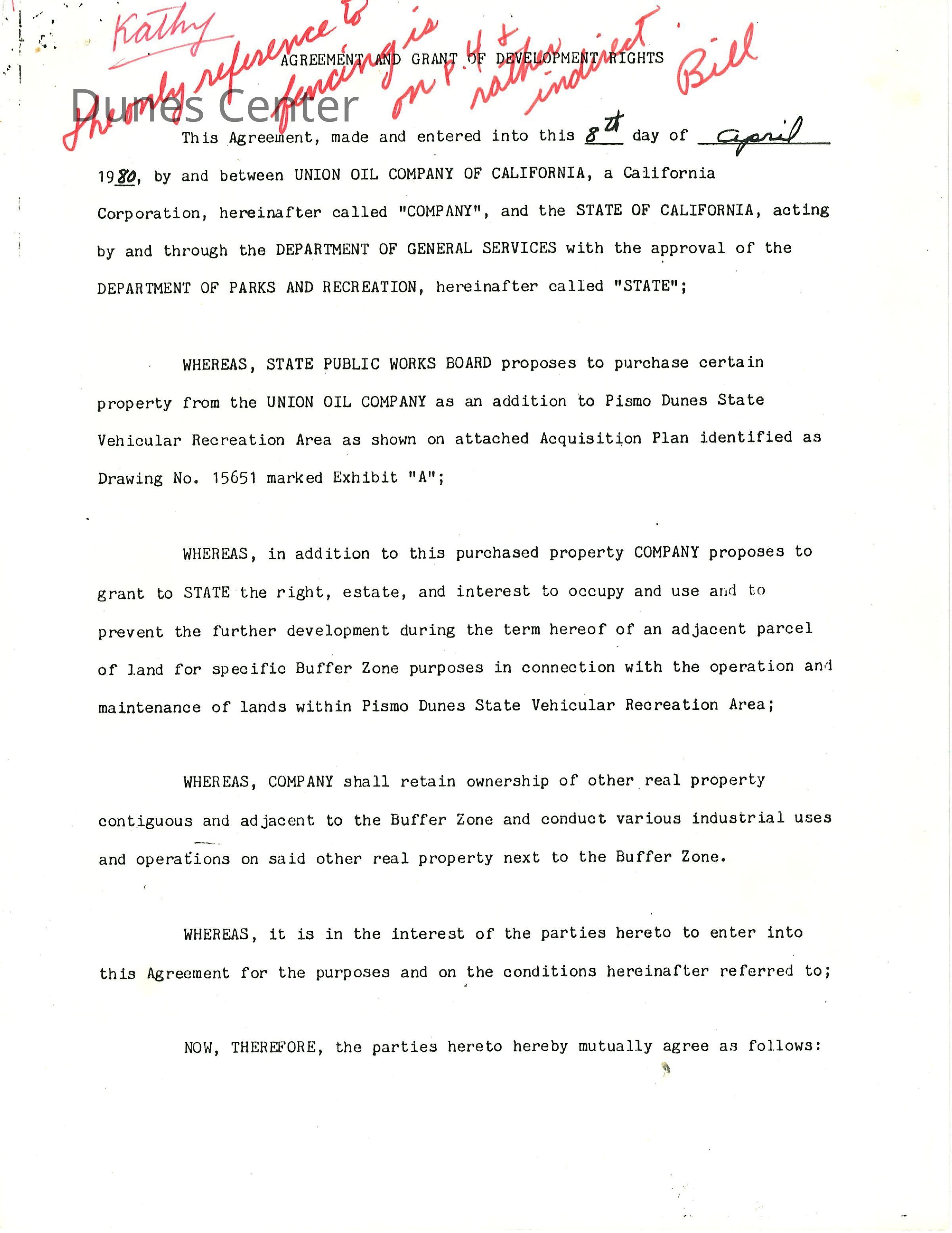 April 8, 1980, agreement between Union Oil Company of California and the State of California about a grant of development rights, includes a map, attached is a note from Kathleen Goddard-Jones to Elizabeth Scott-Graham about destruction caused by off-road vehicles