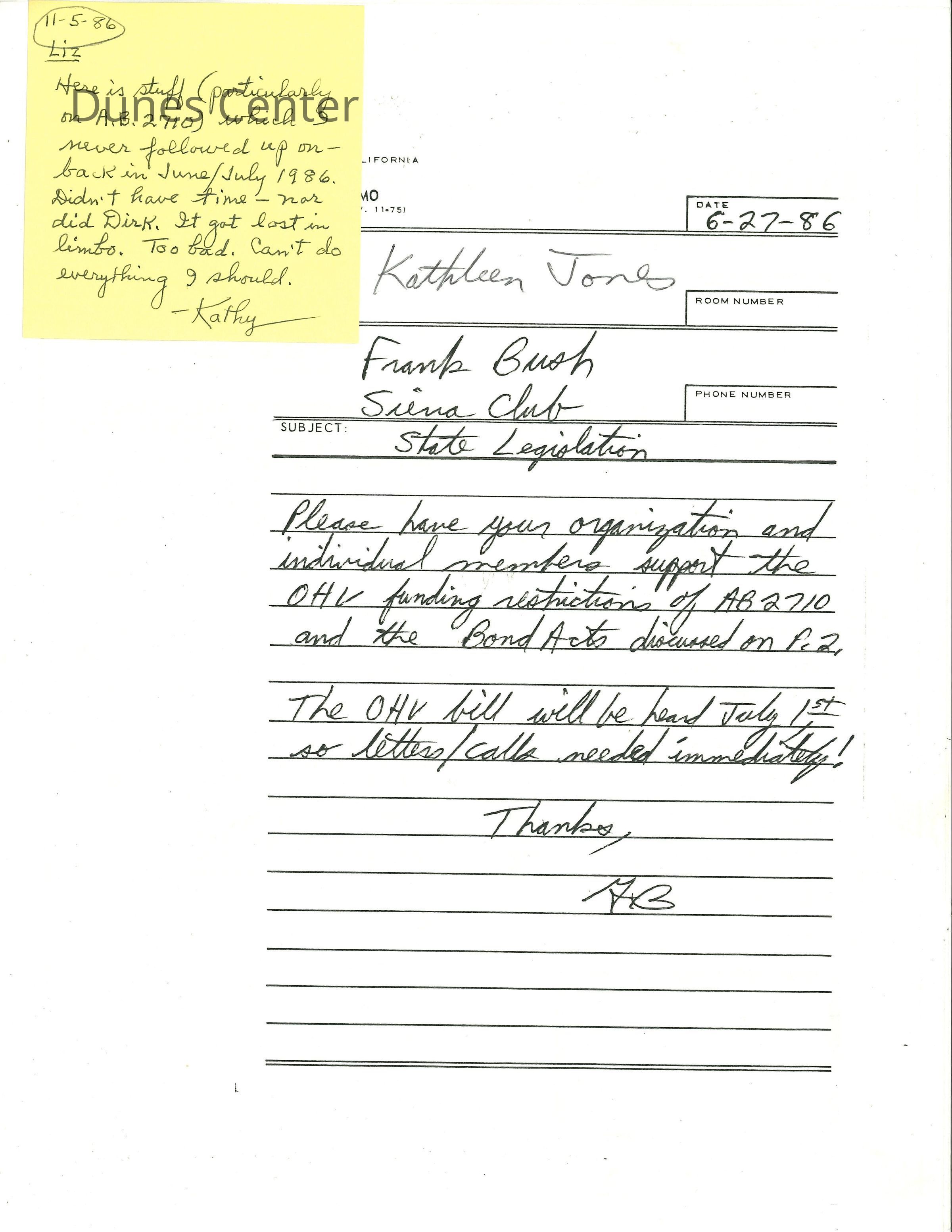 June 1986, Sierra Club legislative agenda, memo from Kathleen Goddard-Jones to Frank Bush of the Sierra Club and note from Kathleen Goddard Jones to Elizabeth Scott-Graham.Collection