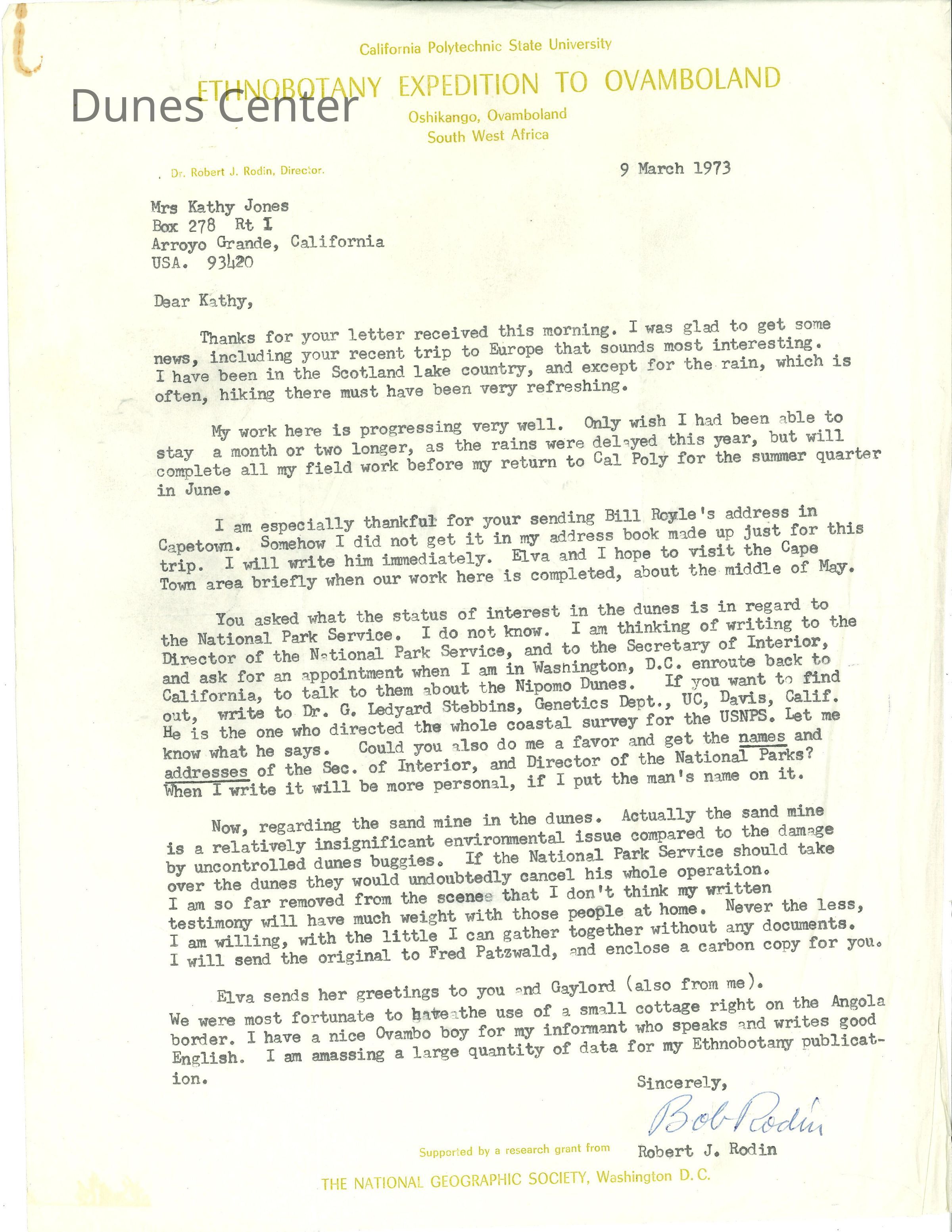 March 9, 1973, letter from Robert J. Rodin to Kathleen Goddard-Jones regarding personal news and issues of dunes management and environmental threats to the dunes, including sand mining.
