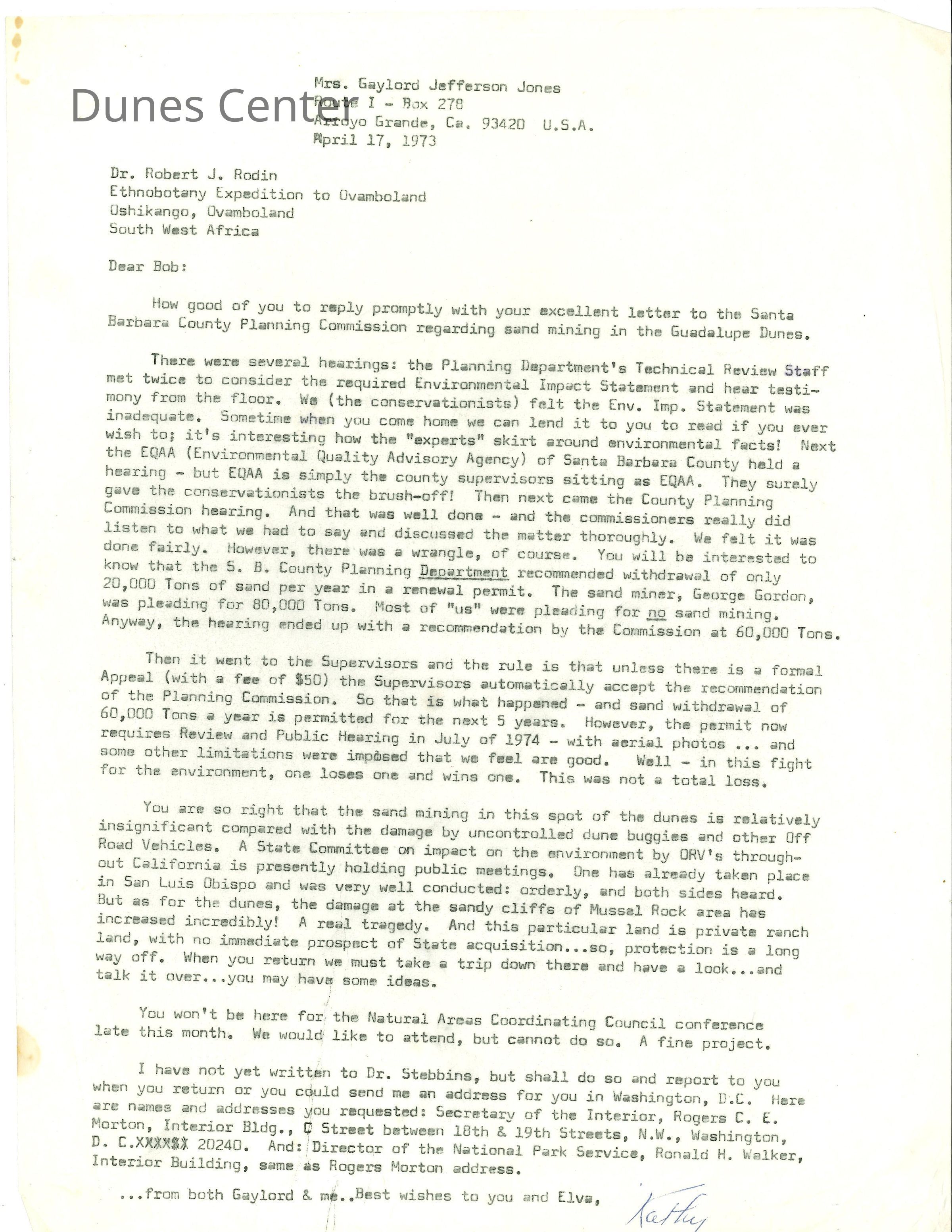 April 17, 1973, letter from Kathleen Goddard-Jones (and Gaylord Jones) to Robert J Rodin regarding sand mining on the dunes and of-road vehicle damage. In response to a letter from March 9 of the same year.