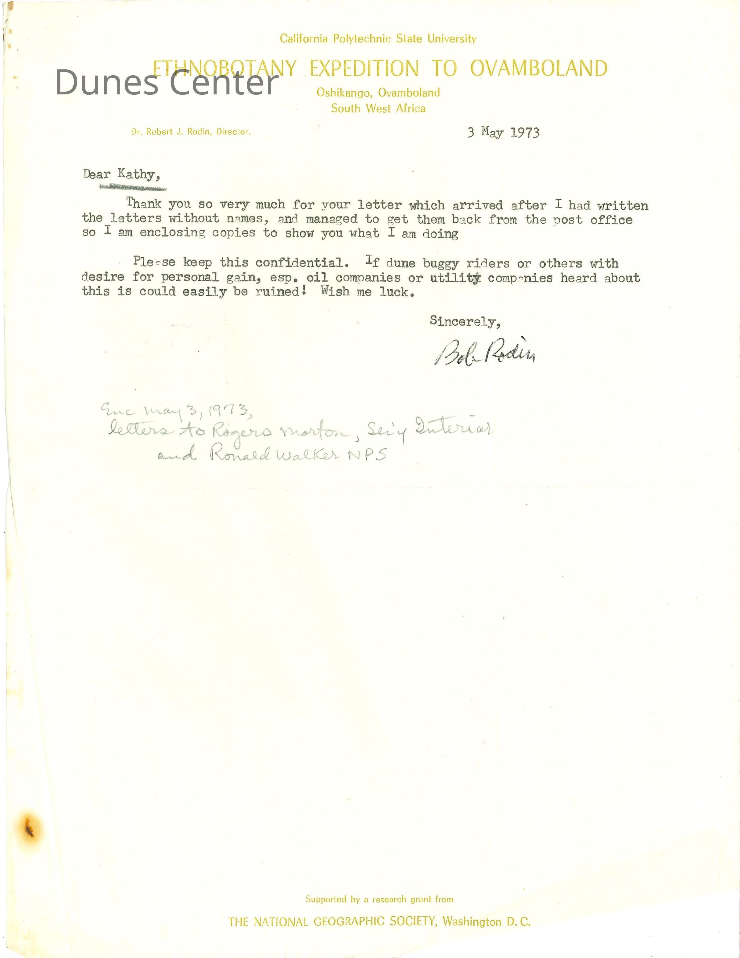 May 3, 1973, letter from Robert J. Rodin to Kathleen Goddard-Jones regarding off-road vehicles, described attachments are not present. In response to a letter from April 17 of the same year.