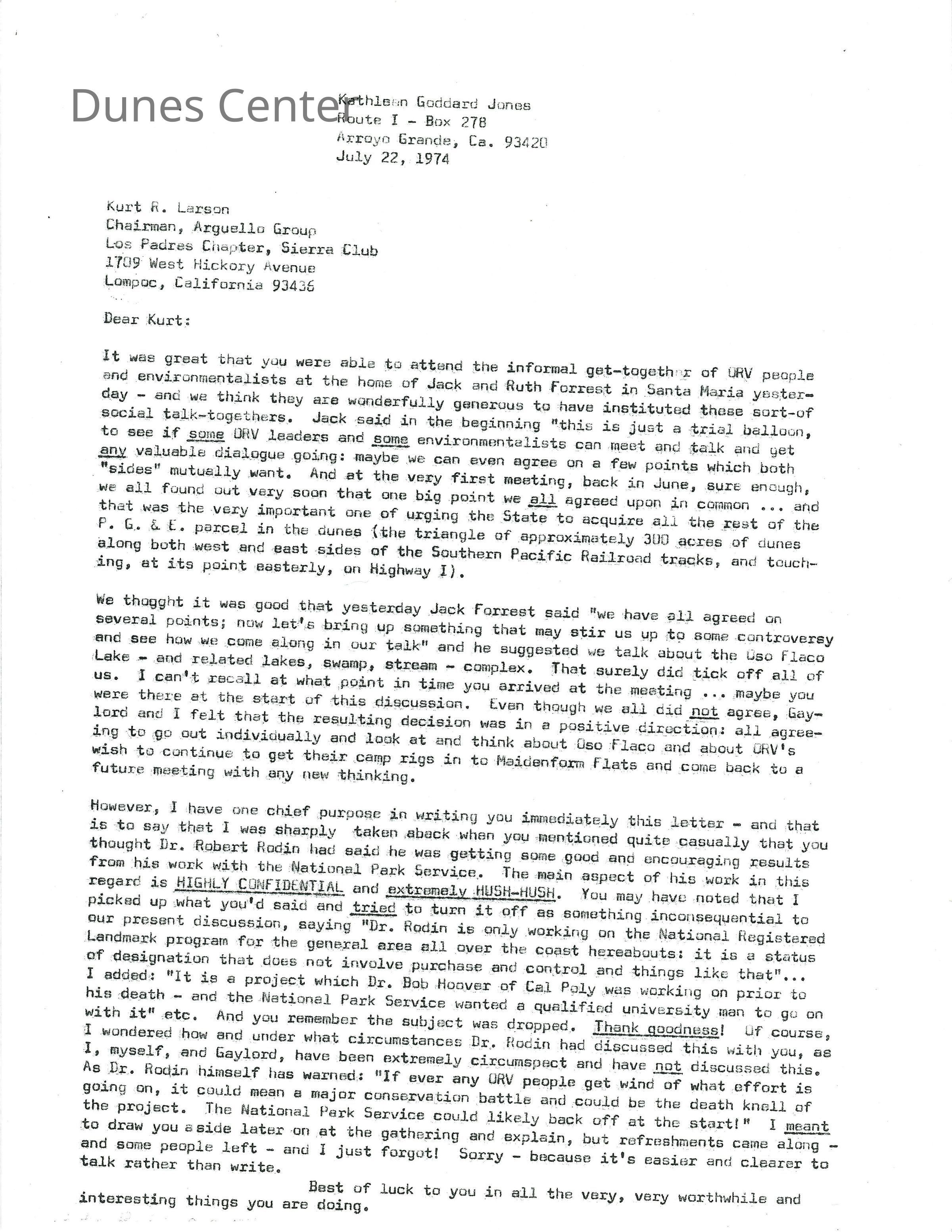 July 22, 1974, letter from Kathleen Goddard-Jones to Kurt Larson, chairman of the Arguello Group of the Los Padres Chapter of the Sierra Club. Covers discussion between environmentalists and off-road vehicle enthusiasts. Includes information about a project conducted by Robert Rodin with the National Park Service.