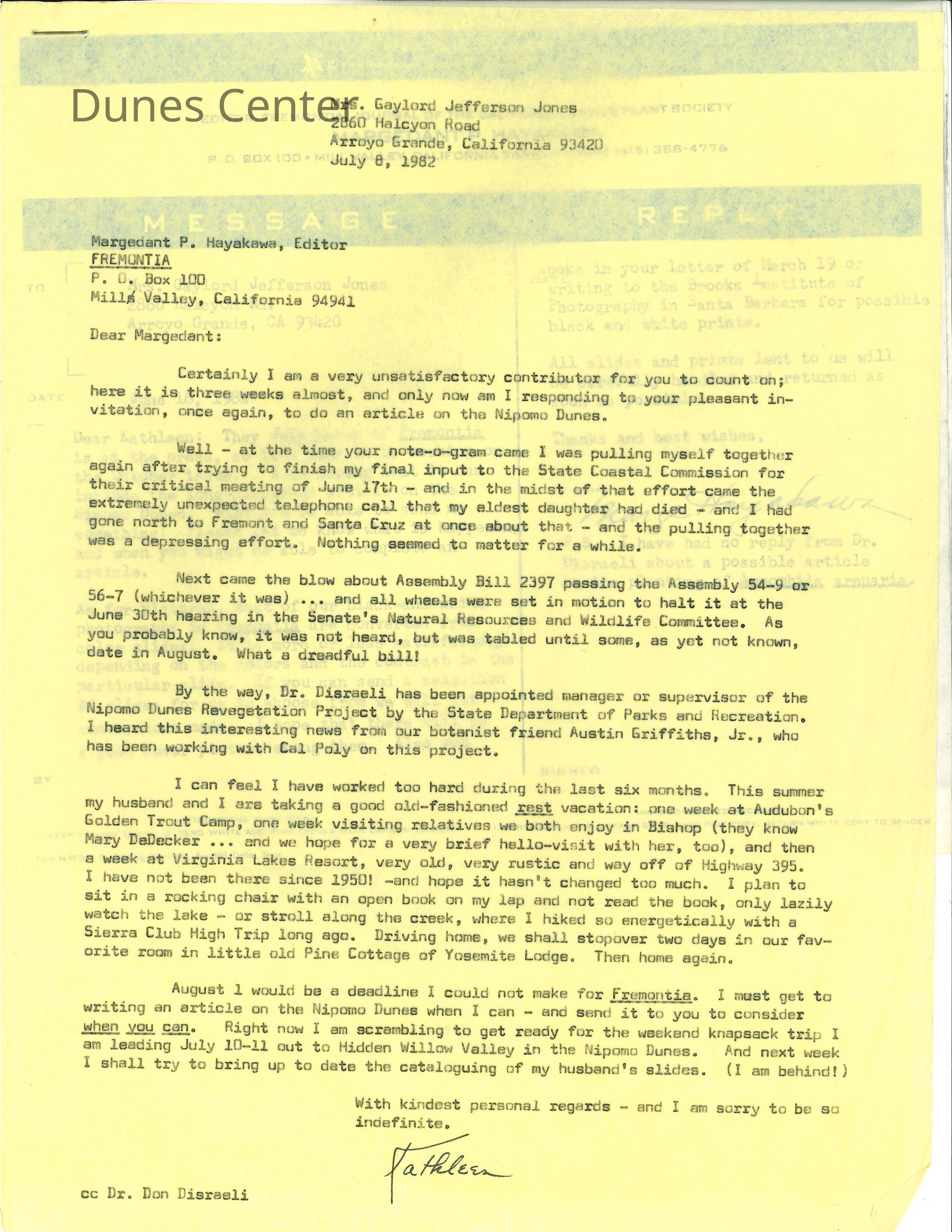 July 8, 1982, letter from Kathleen Goddard-Jones to Margedant P. Hayakawa, editor of Fremonita regarding personal matters and an article about the Nipomo Dunes. Attached is a response from Margedant Hayakawa dated June 16.