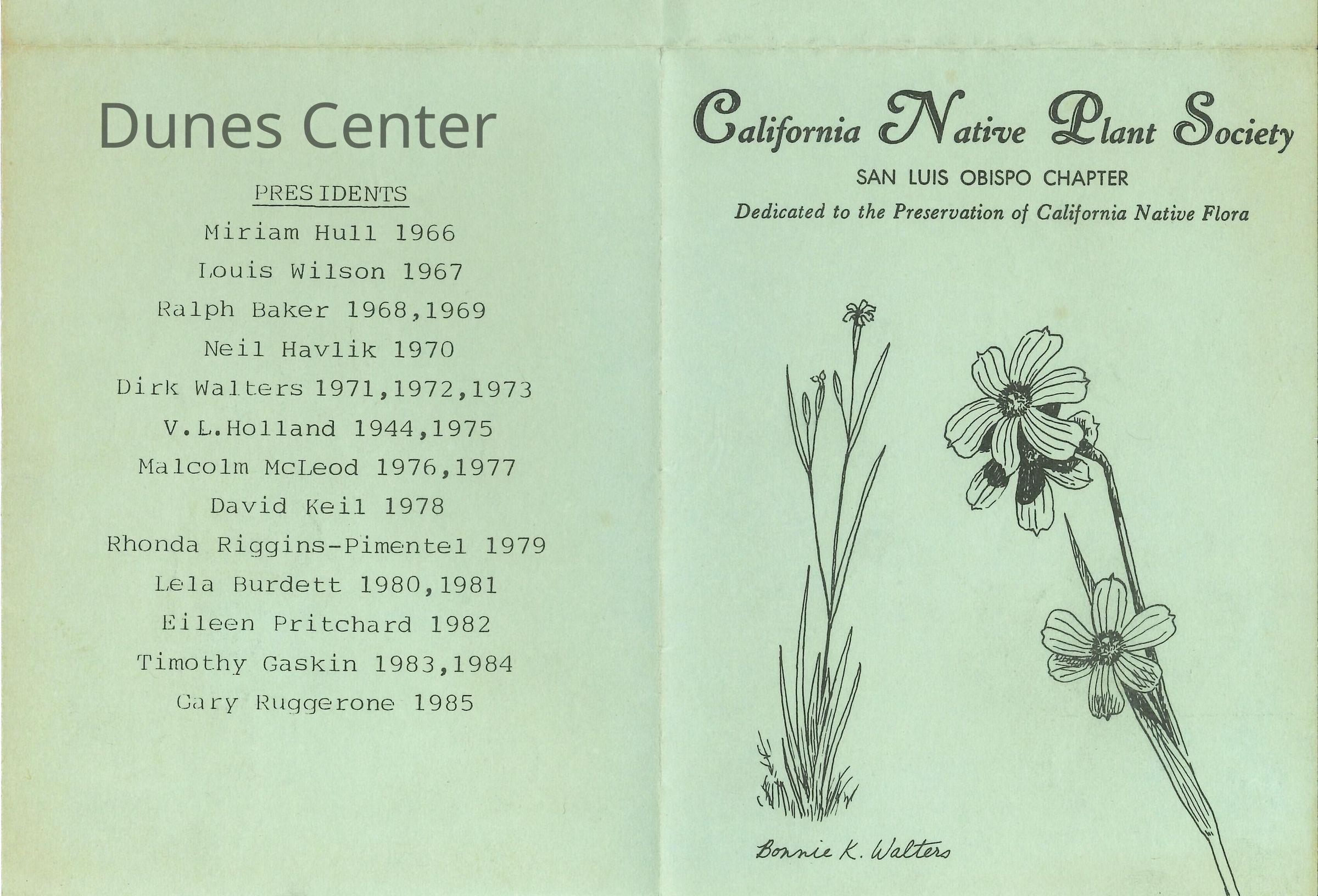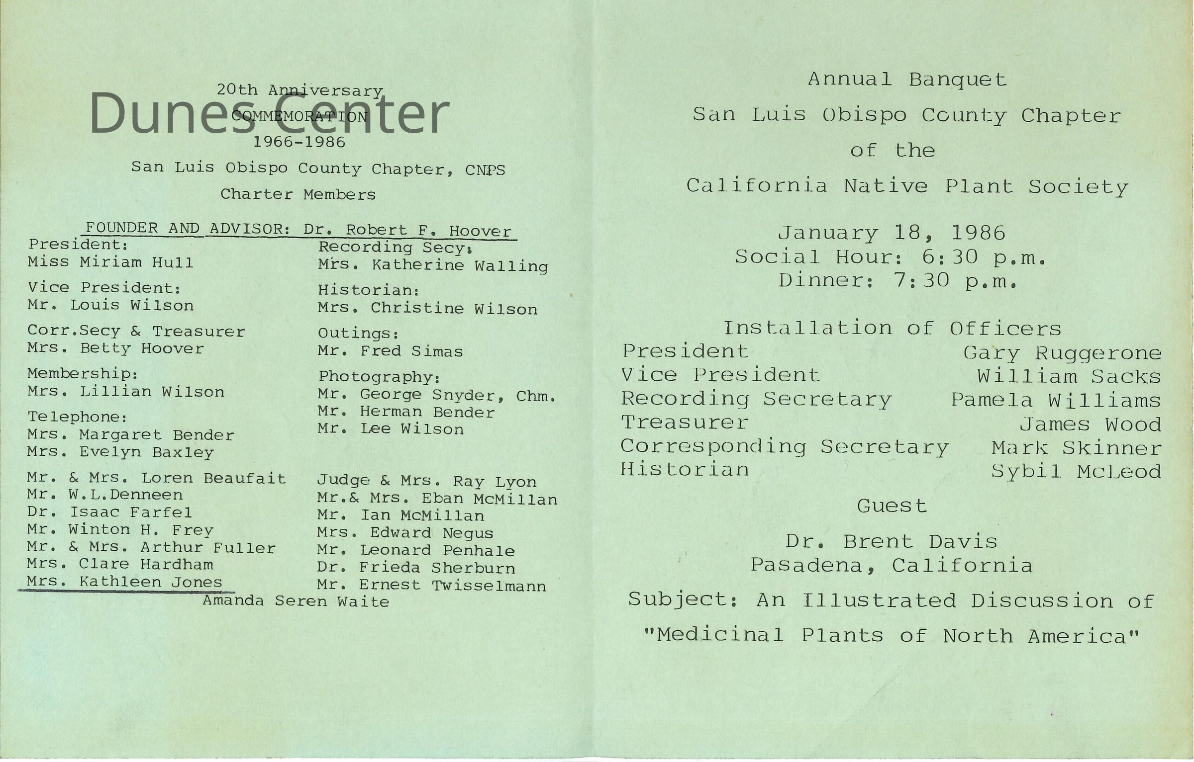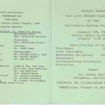 January 18, 1986, San Luis Obispo County Chapter of the California Native Plant Society annual banquet. Kathleen Goddard-Jones is listed as a charter member of the organization.