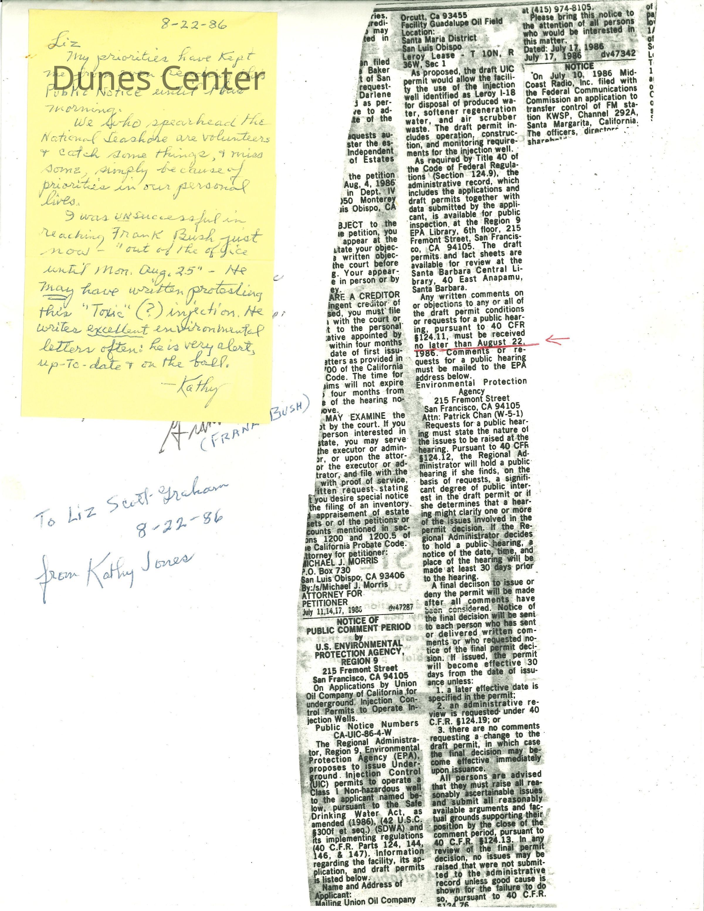 August 22, 1986, notice of a proposed permit to allow injection of waste at the Guadalupe Oil Field. Includes a note from Frank Bush to Kathleen Goddard-Jones urging People for a Nipomo Dunes National Seashore to consider questioning the permit and a note form Kathleen Goddard-Jones to Elizabeth Scott-Graham.