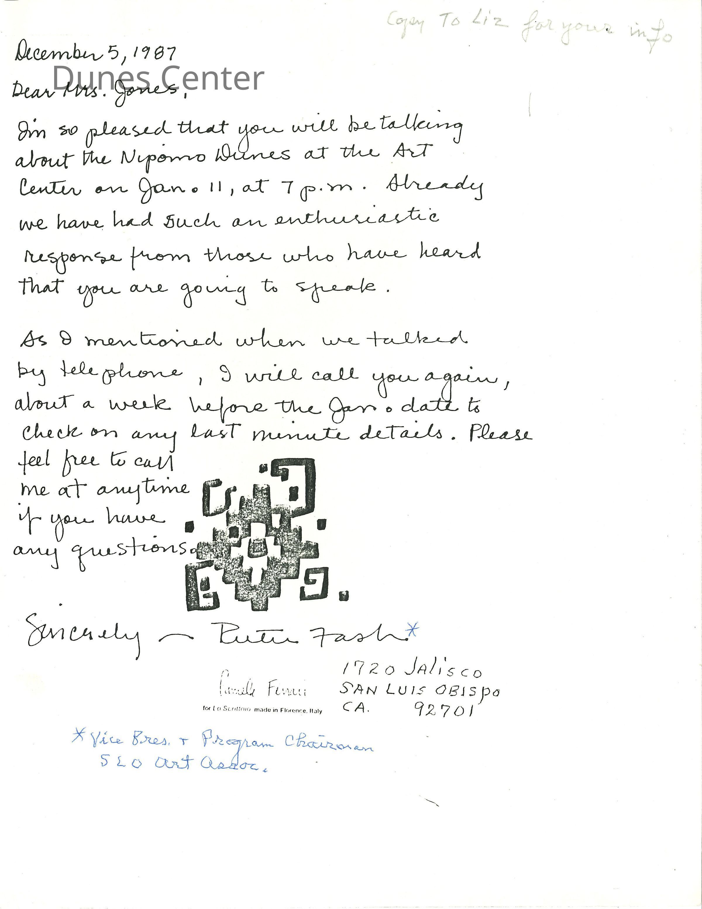 December 5, 1987, letter from Peter Fash, Vice President and Program Chairman of the SLO Art Association to Kathleen Goddard-Jones regarding a planned talk about the dunes.