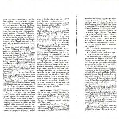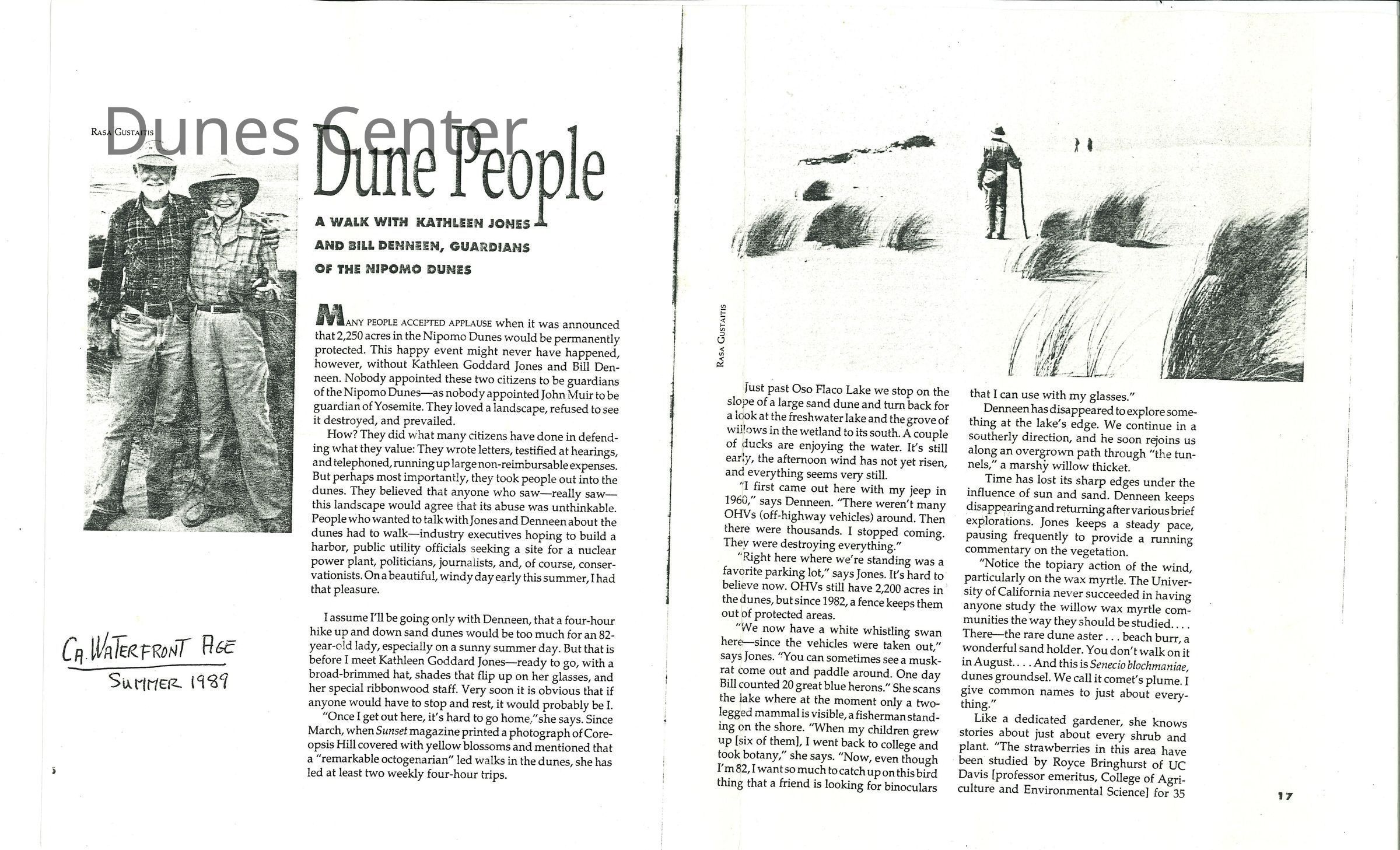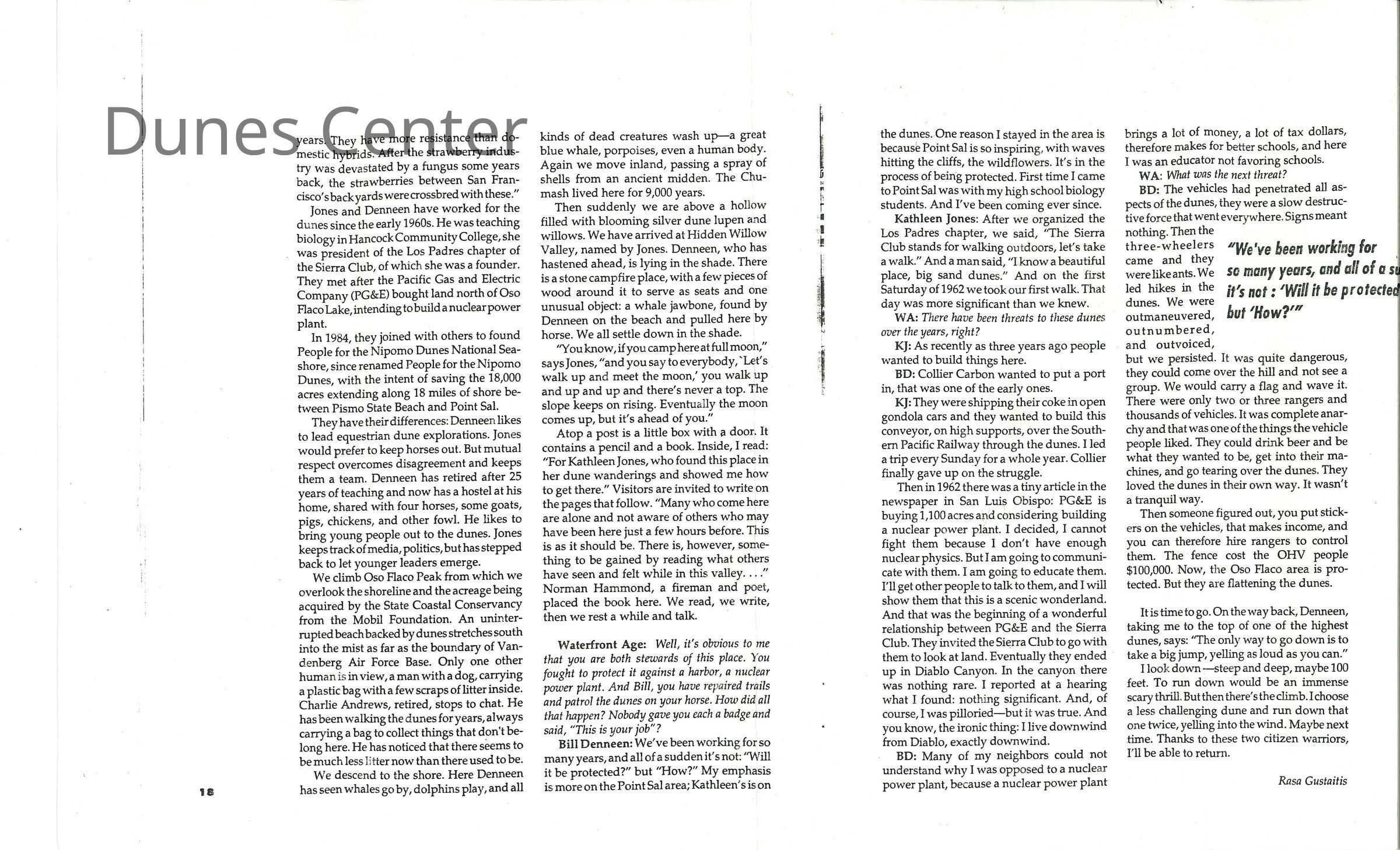 Summer 1989, article by Rasa Gustaitis titled "Dune People: A walk with Kathleen Jones and Bill Denneen, guardians of the Nipomo Dunes". Interviews Kathleen Goddard-Jones and Bill Denneen, includes photos.