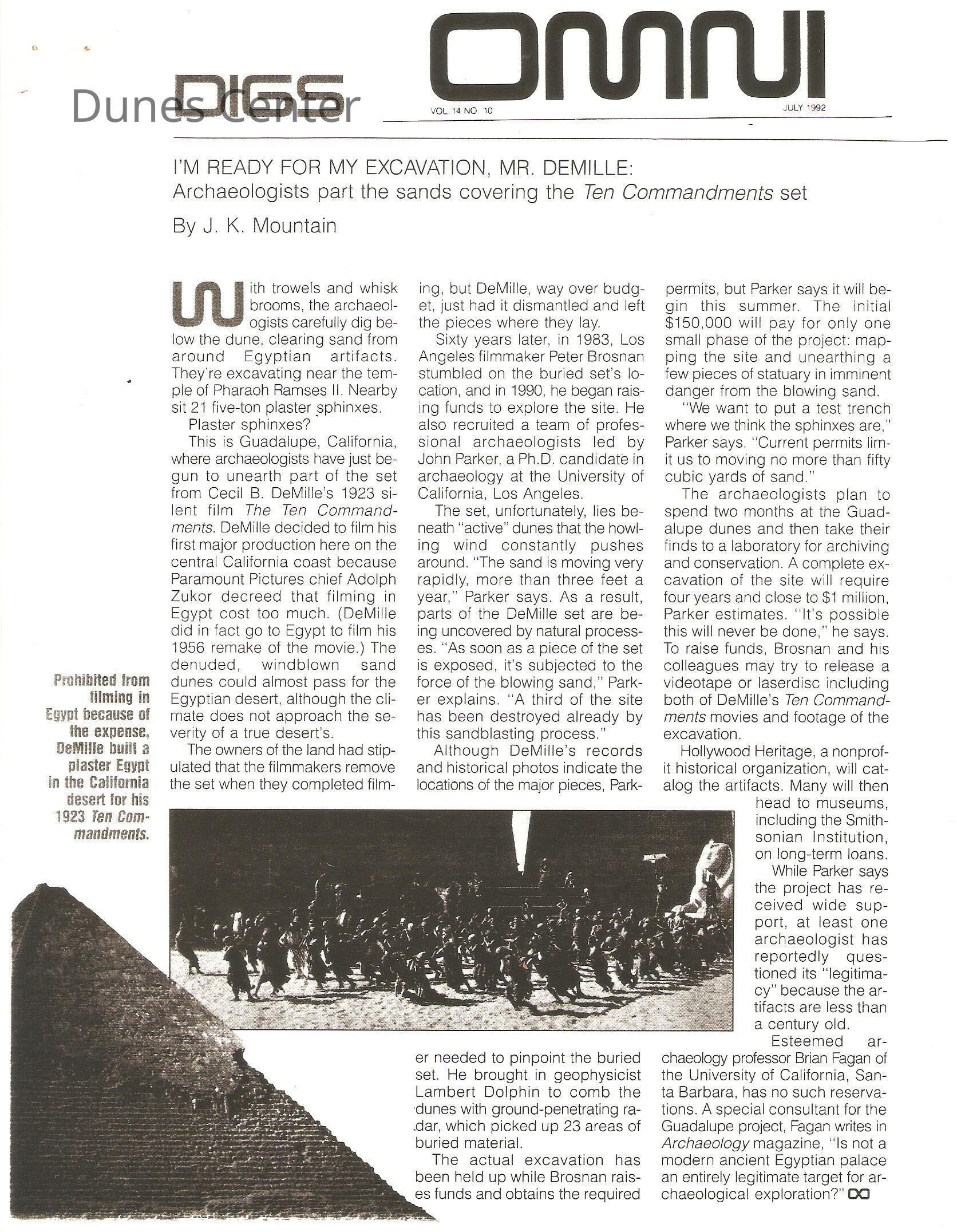 "I'm Ready for My Excavation, Mr. Demille: Archaeologist part the sands covering the Ten Commandments set." Information about the the excavation site and the process of raising money for an excavation. Written by J.K. Mountain.Entry/Object ID