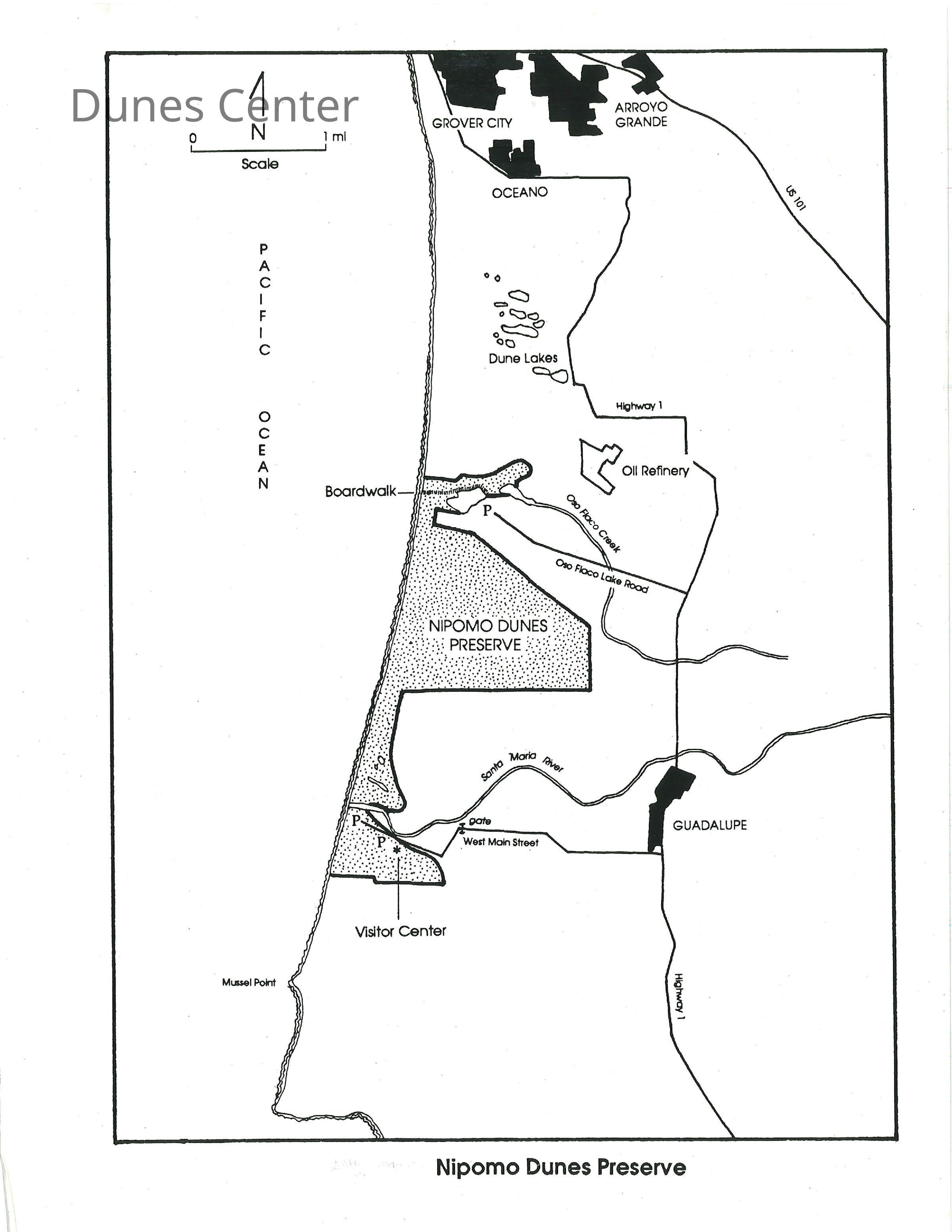 Map of Nipomo Dunes Preserve, highlights boardwalk, visitor center, and parking.Collection