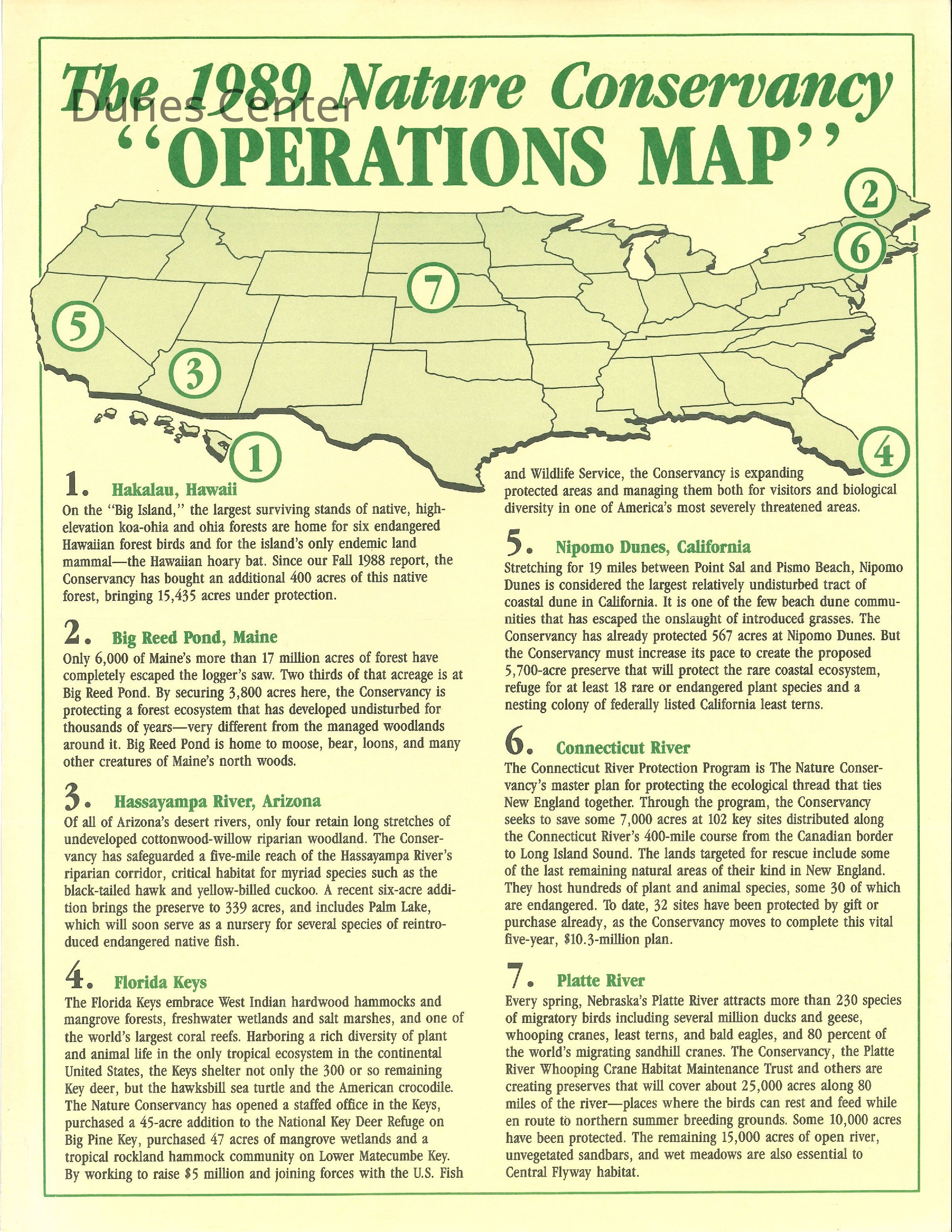 1989 Nature Conservancy "Operations Map": map of the United States highlighting 7 sites being protected and managed by the Nature Conservancy, including the Nipomo Dunes.
