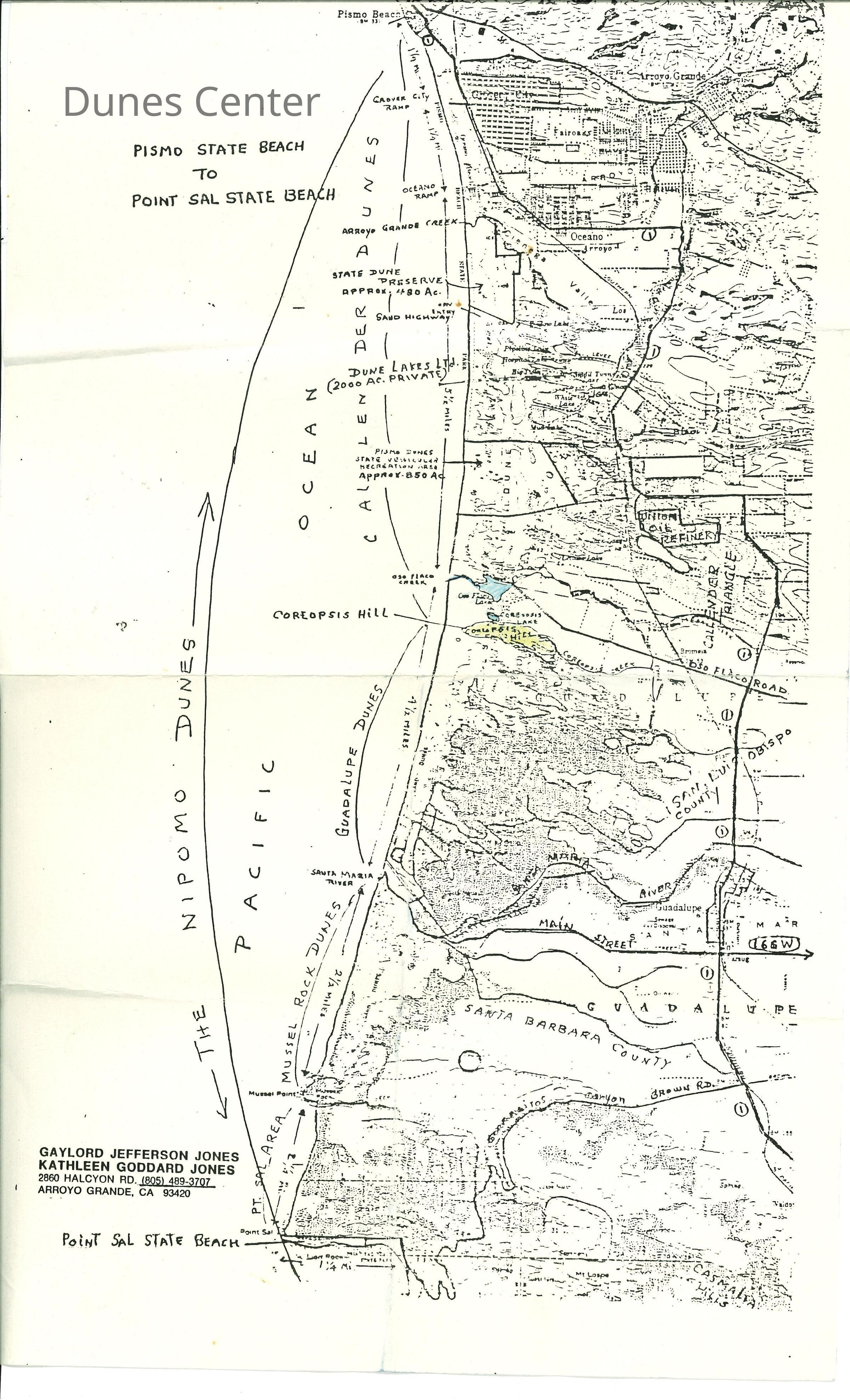 Map of the California coastline from Pismo State Beach to Point Sal State Beach, highlights landmarks of the dunes.Collection