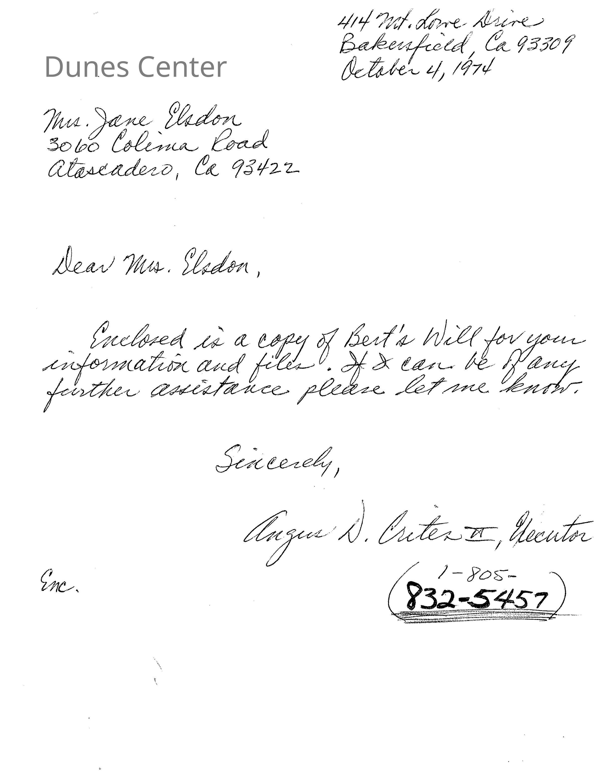 Letter from Angus D. Crites, executor of Bert Schievink's will, to Jane Elsdon.