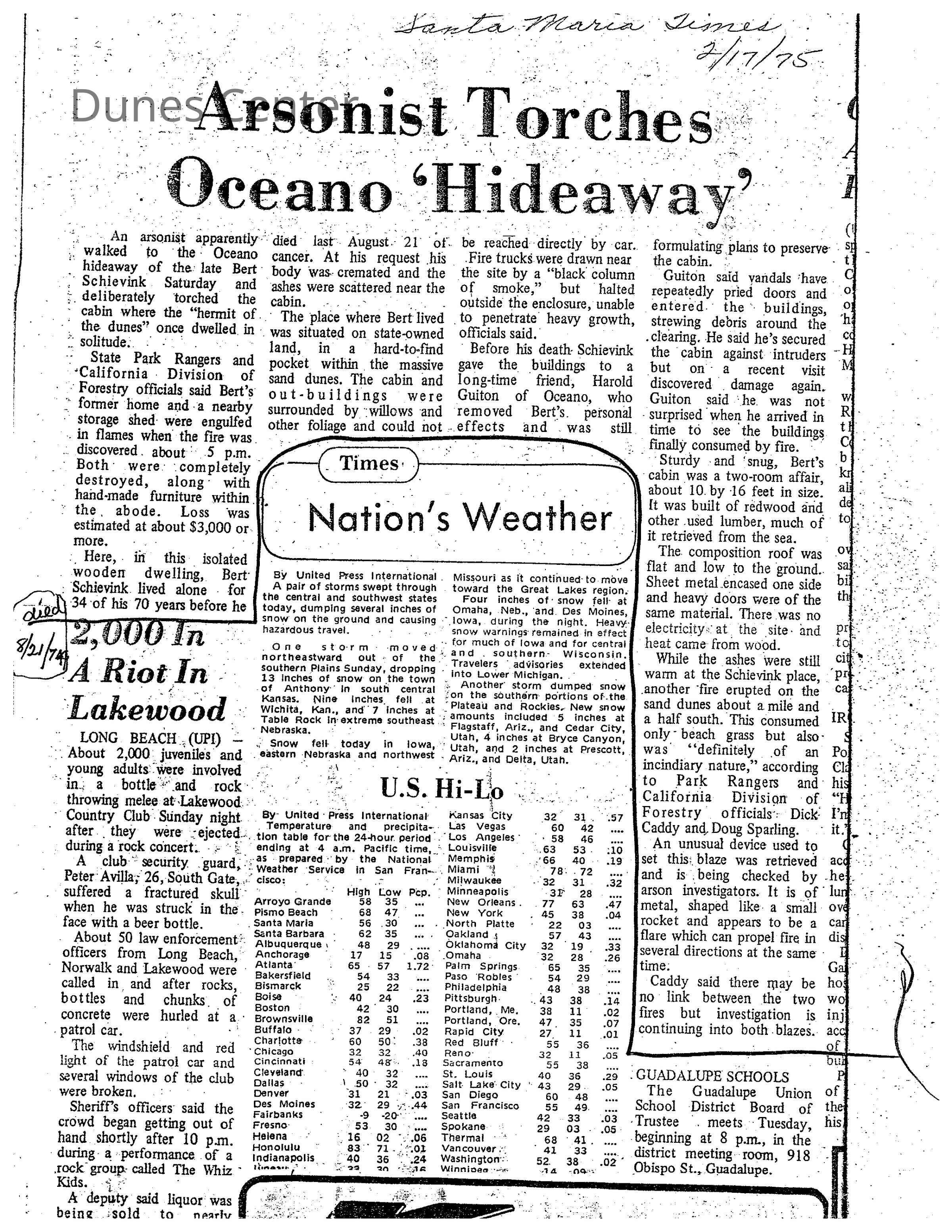 Article titled "Arsonist Torches Oceano Hideaway," discusses the burning of Bert Schievink's dunes cabin after his death.