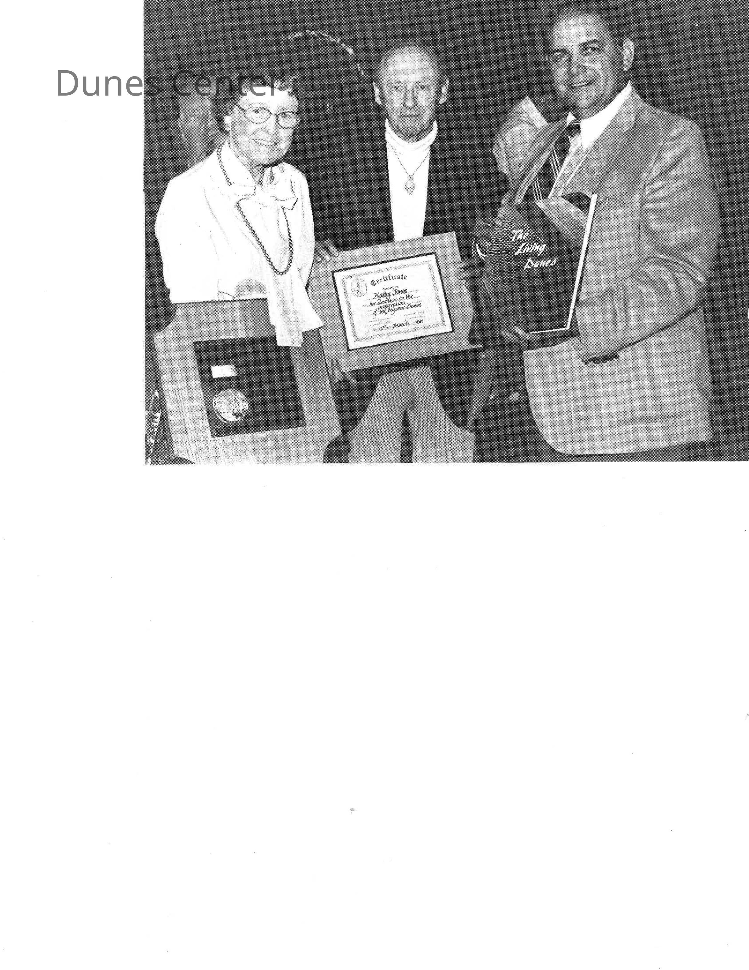 Mrs. Jones at the Sierra Club San Lucia Chapter annual banquet. Kathleen Goddard Jones Arroyo Grande conservationist, holding plaque presented to her by the Coastal San Luis Resource Conservation District to honor her "Conservationist of the Year." Her husband Gaylord, center, holds the certificarte presented. Photo by John Read.Collection