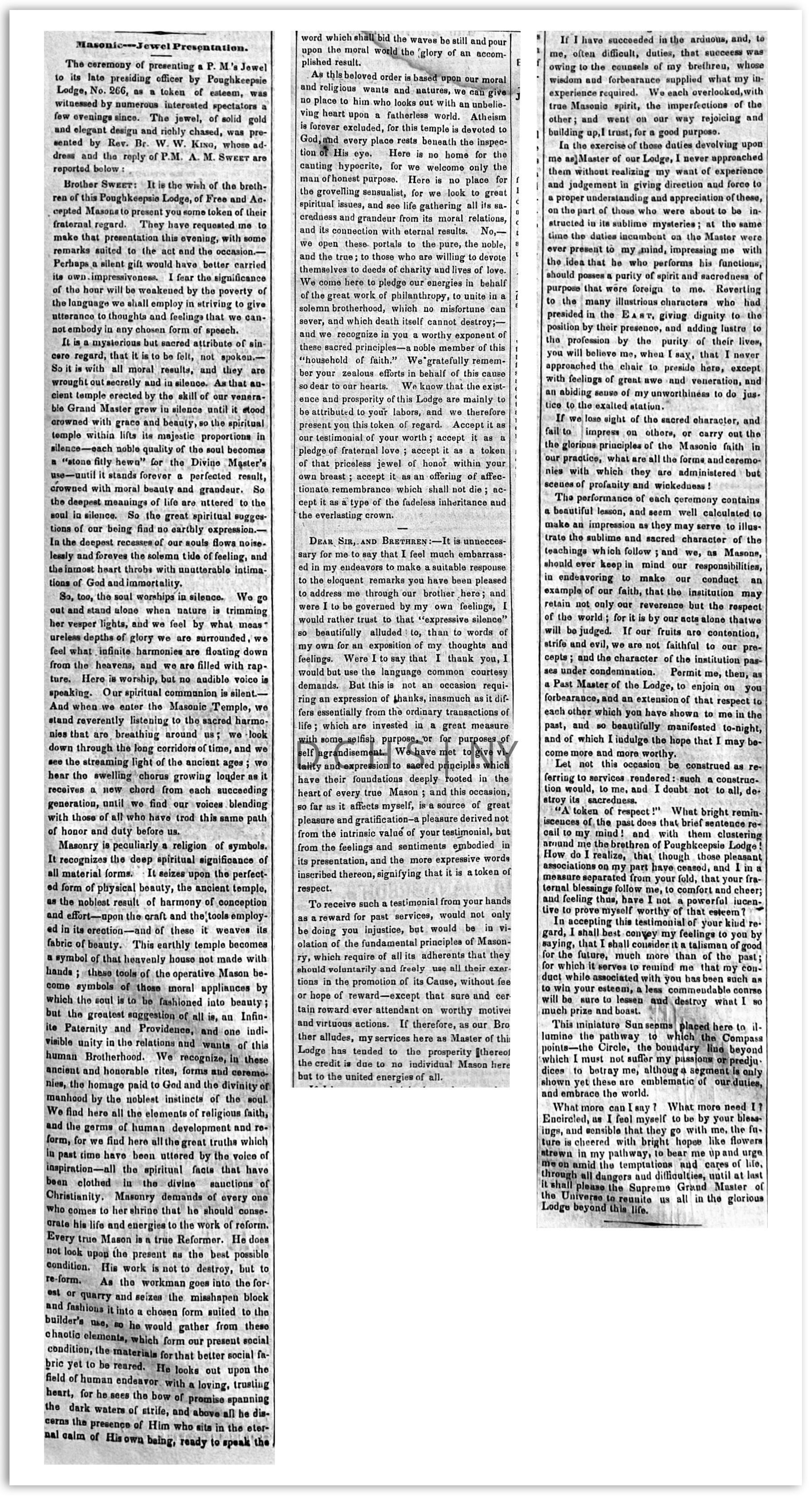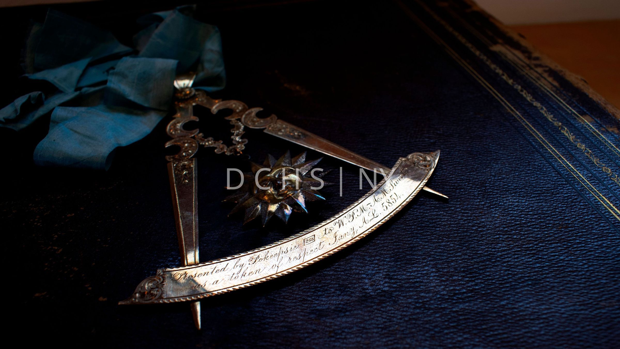 1854 Masonic Jewel with light blue collar, Gold square and compass with sun. “Presented by Poughkeepsie 266 to W.P.M A.M. Sweet as a token of respect Jany A.L. 5854”