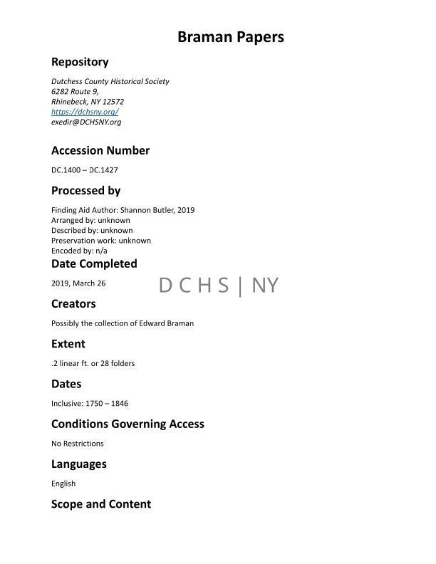 The collection consists of early deeds, bonds, bill of sales, including two for sale of slaves, from various individuals in the Crum Elbow/Charlotte precinct area. Items collected by Edward Braman.Publication Details