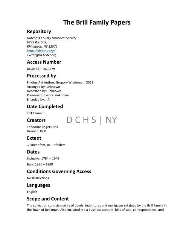 The collection consists mainly of deeds, indentures and mortgages retained by the Brill Family in the Town of Beekman. Also included are a business account, bills of sale, correspondence, and some ephemera. The collection also contains a scrapbook made by Theodore Brill, and Henry C. Brill’s diary of farm operations.Publication Details