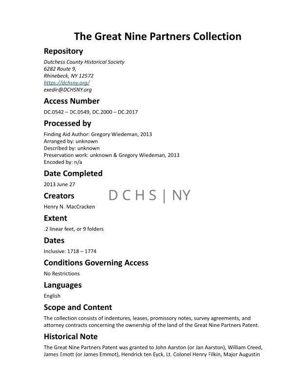 The collection consists of indentures, leases, promissory notes, survey agreements, and attorney contracts concerning the ownership of the land of the Great Nine Partners Patent.Publication Details
