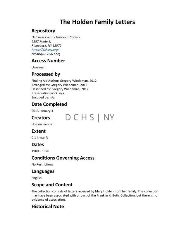 The collection consists of letters received by Mary Holden from her family. This collection may have been associated with or part of the Franklin K. Butts Collection, but there is no evidence of association.