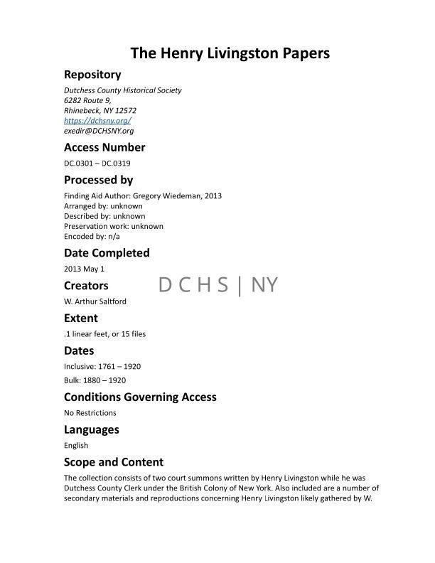 The collection consists of two court summons written by Henry Livingston while he was Dutchess County Clerk under the British Colony of New York. Also included are a number of secondary materials and reproductions concerning Henry Livingston likely gathered by W. Arthur Saltford, judging from an envelope in the collection, and the original correspondence surrounding the popularization of the Livingston claim to “A Visit from St. Nicholas.”Publication Details