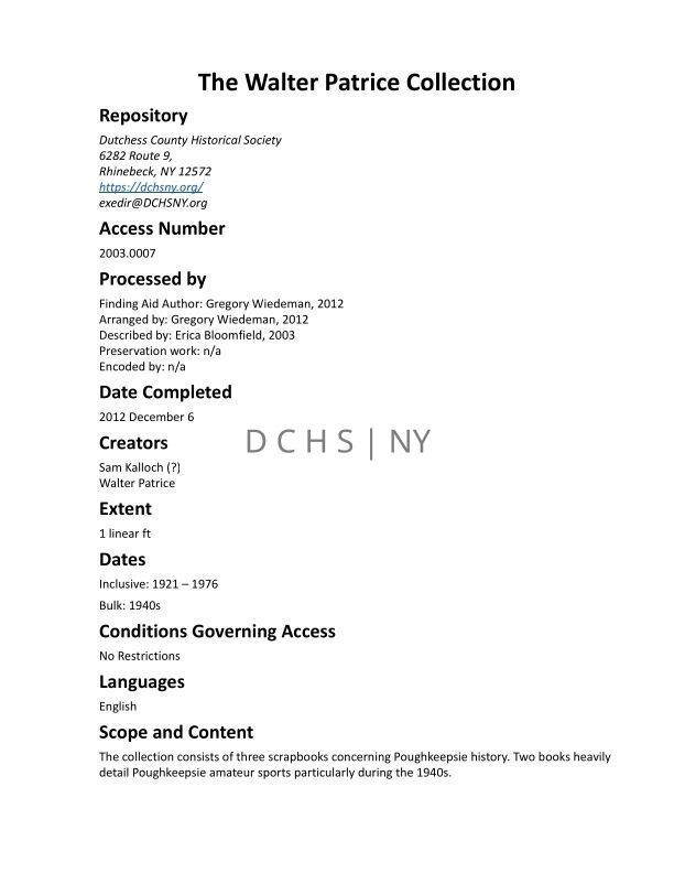 The collection consists of three scrapbooks concerning Poughkeepsie history. Two books heavily detail Poughkeepsie amateur sports particularly during the 1940s.Publication Details
