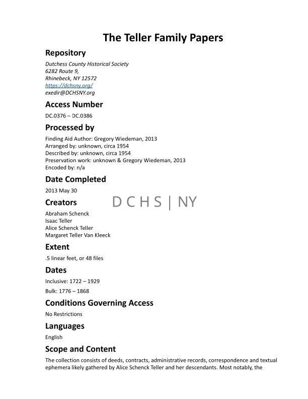 The collection consists of deeds, contracts, administrative records, correspondence and textual ephemera likely gathered by Alice Schenck Teller and her descendants. Most notably, the collection includes administrative records of seven companies serving in the American Revolution garrisoning the forts of the Hudson Highlands from 1776 until 1777. These records include payrolls, accounts of rations and mileage.Publication Details