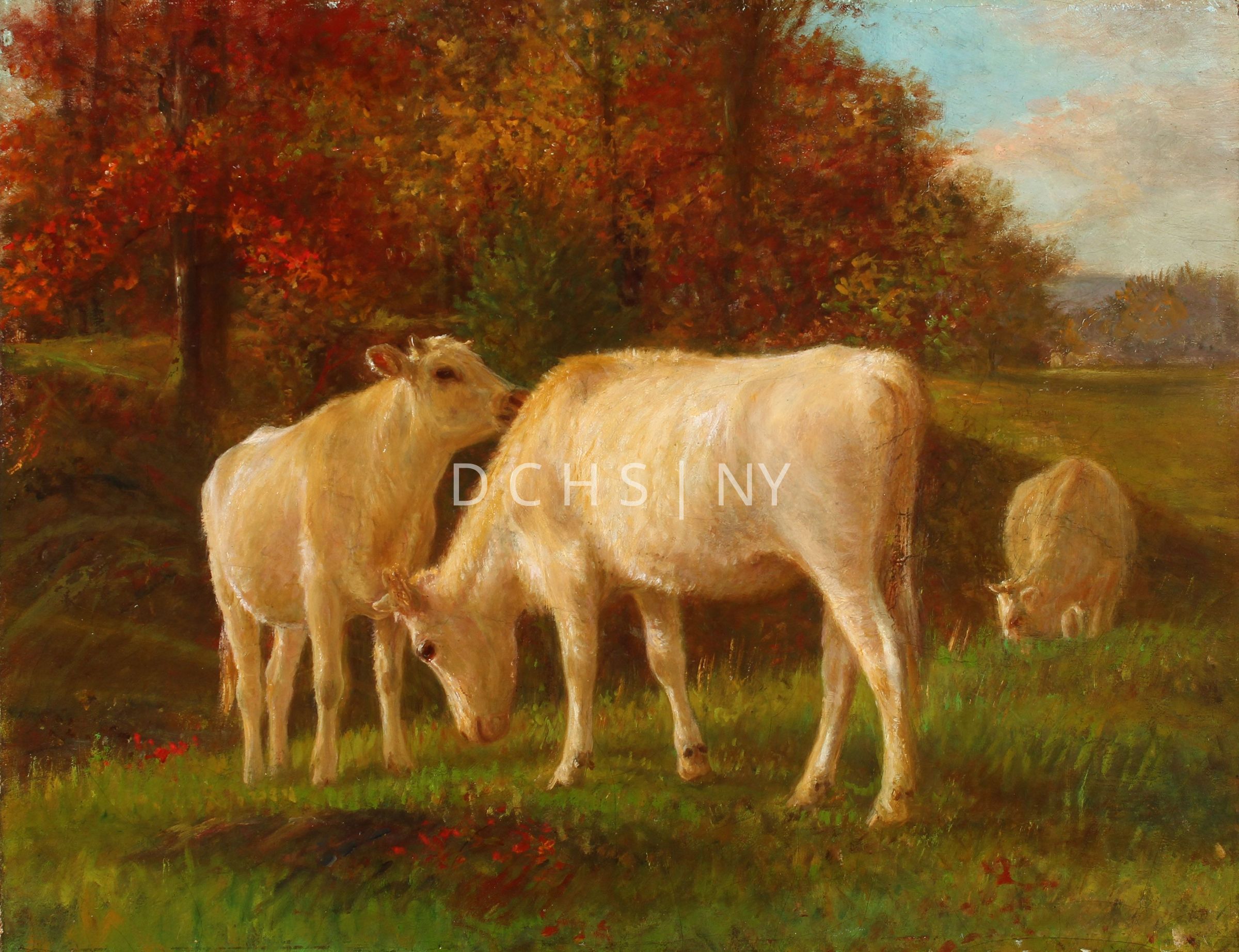 ![Untitled (Three White Cows) [no date]: View of an autumn landscape with three white cows. In the foreground are grasses, a section of a flat stone, and small red flowering plants. In the center of the middle ground are two white cows. The one on the left stands angled toward the viewer toward the right. To the right, the other cow stands facing toward the left in profile, with its head lowered to graze. Behind this white cow, in the slight distance, is another white cow, whose body faces the viewer while its head is angled lower toward the left. The two central white cows stand on what appears to be the top of a hill/incline. On the other side of this incline is another hill with trees with reddish orange leaves. To the right is a section of grass. In the furthest background on the right are more trees on a hill, and the suggestion of mountains. The sky is relegated to the upper right corner, with blue and white clouds.](https://d8e7jbdw4fu0e.cloudfront.net/14483/675dea00-c557-11f0-bdc0-3d01bb4fb23f-vd7OYc3.lg@2x.jpg)