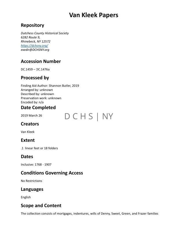 VAN KLEECK: Van Kleeck PapersEntry/Object ID