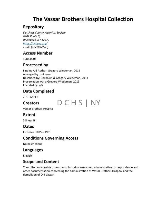 The collection consists of contracts, historical narratives, administrative correspondence and other documentation concerning the administration of Vassar Brothers Hospital and the demolition of Old Vassar.