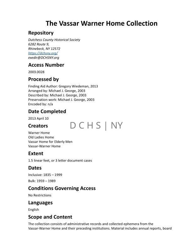 The collection consists of administrative records and collected ephemera from the Vassar-Warner Home and their preceding institutions. Material includes annual reports, board reports directories, residence lists, cemetery records, and some administrative correspondence. There are also some relevant newspaper clippings, ephemera, and photographic prints in the collection.Publication Details