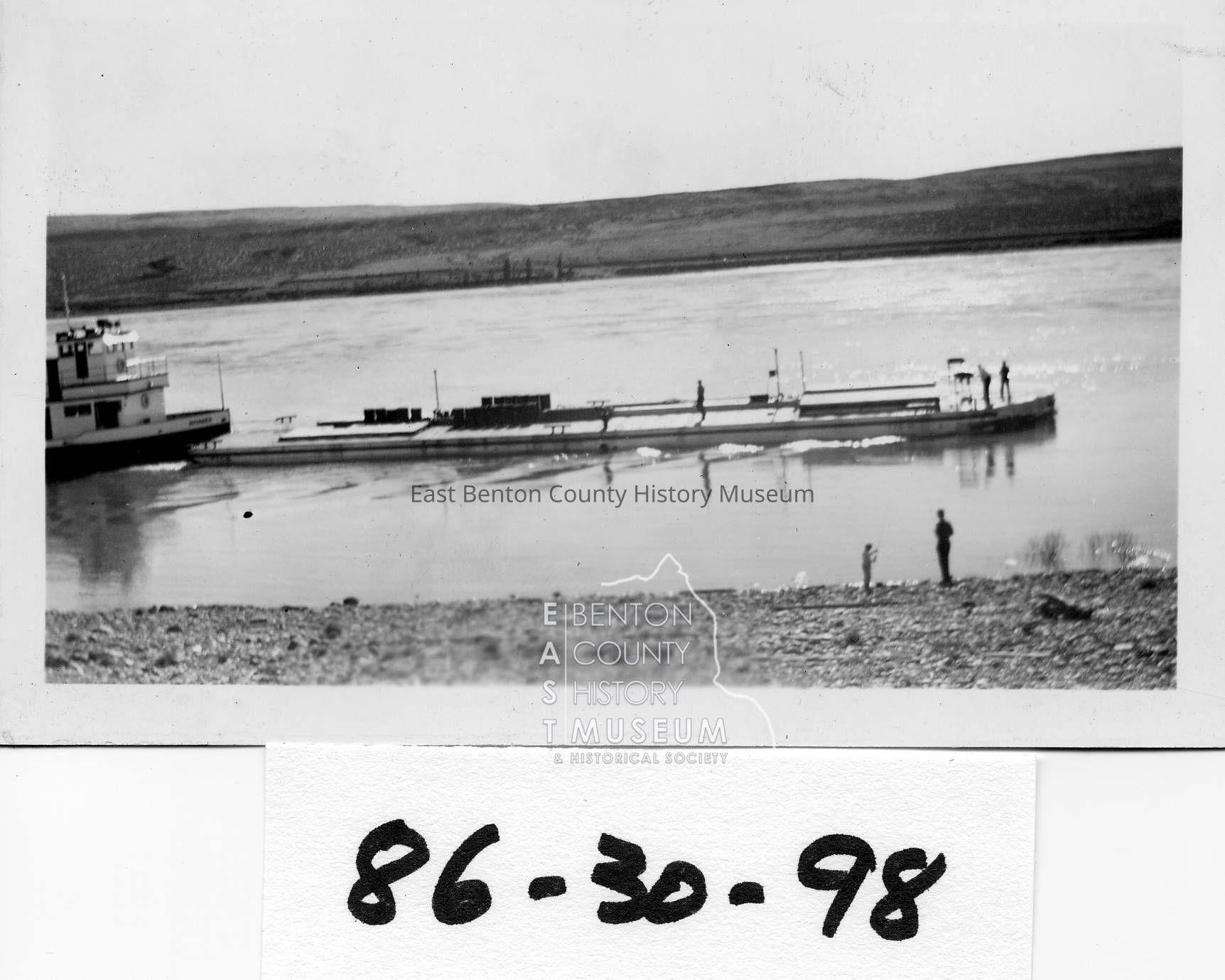 Gas Barge on Columbia near Hover across the River from Attalia. 4 men on barge, 2 fishermen on shore. No ID's