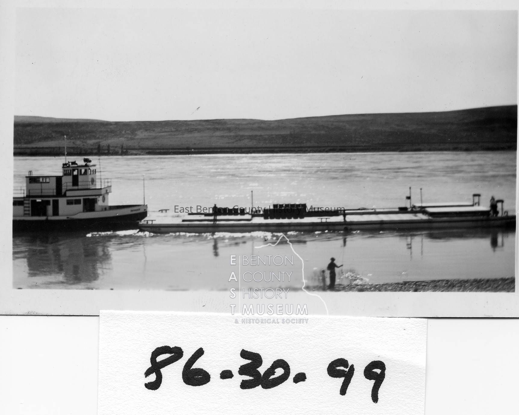 Gas Barge on Columbia near Hover across the River from Attalia. 4 men on barge, 2 fishermen on shore. No ID's