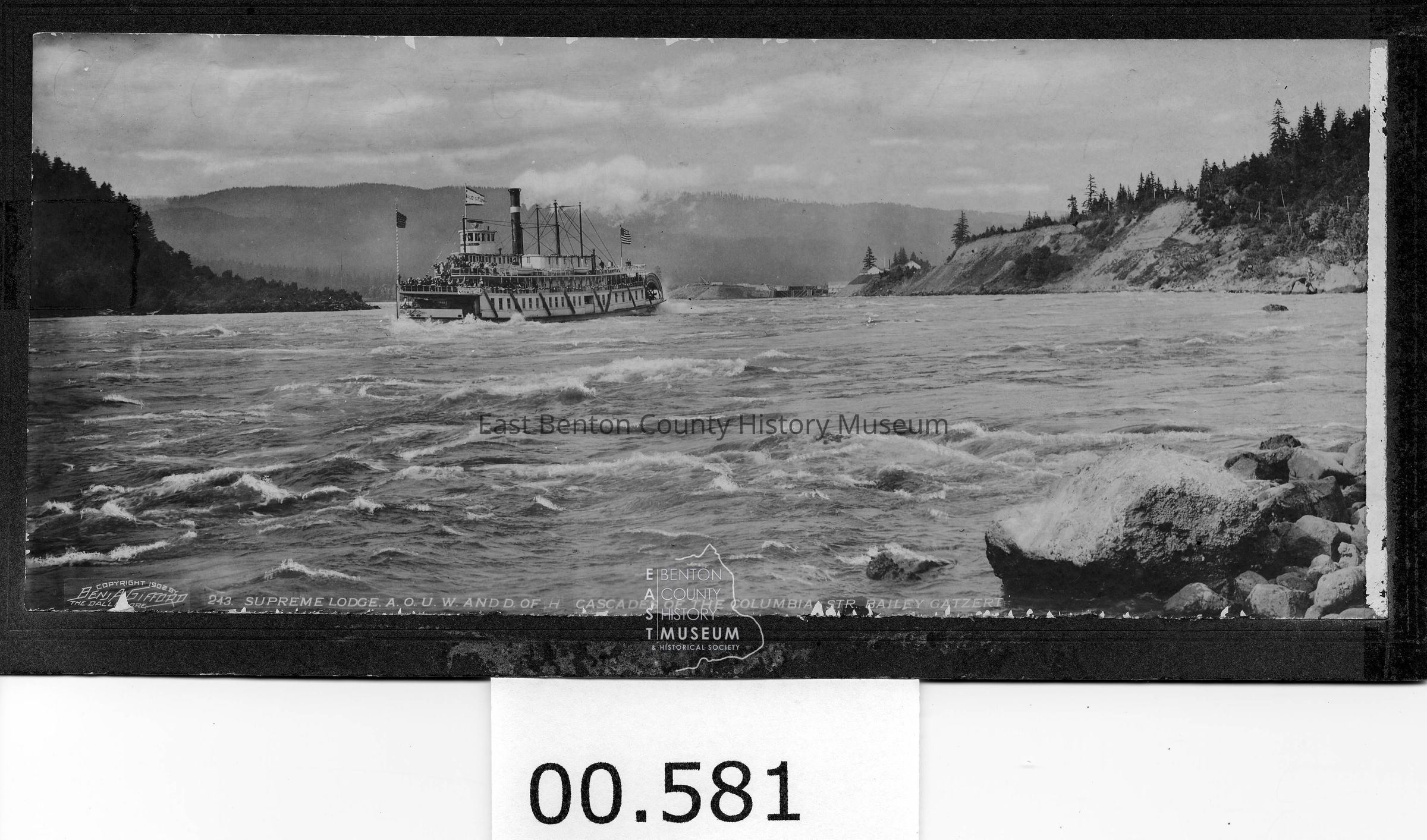 Bailey Gatzert at Cascades of Columbia River at full steam. , The Supreme Lodge A.O.U.W. & D.O.N on board on excursion. Photo by Benj. A. Gifford., the Dalles, OR #243
