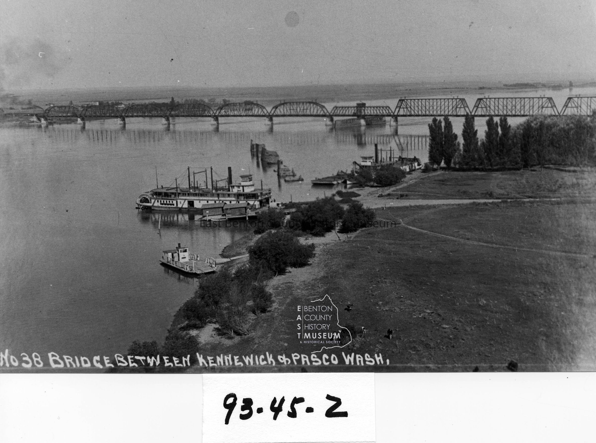 Ferry docked at Kennewick side of Columbia River. Railroad bridge also visible.Tags