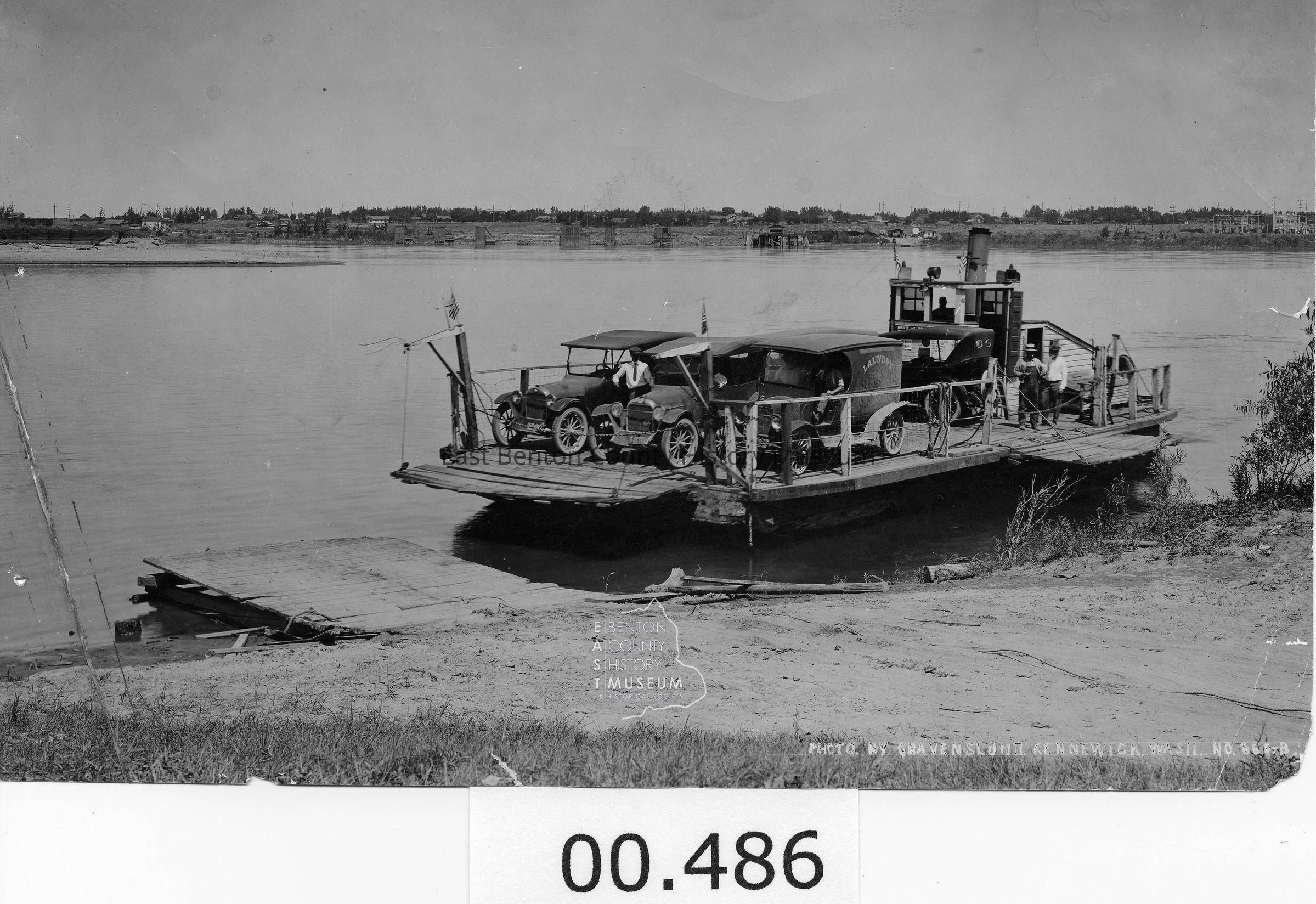 Ferry running between Pasco and Kennewick, 1916. Four autos on board. Photo by Gravenslund.