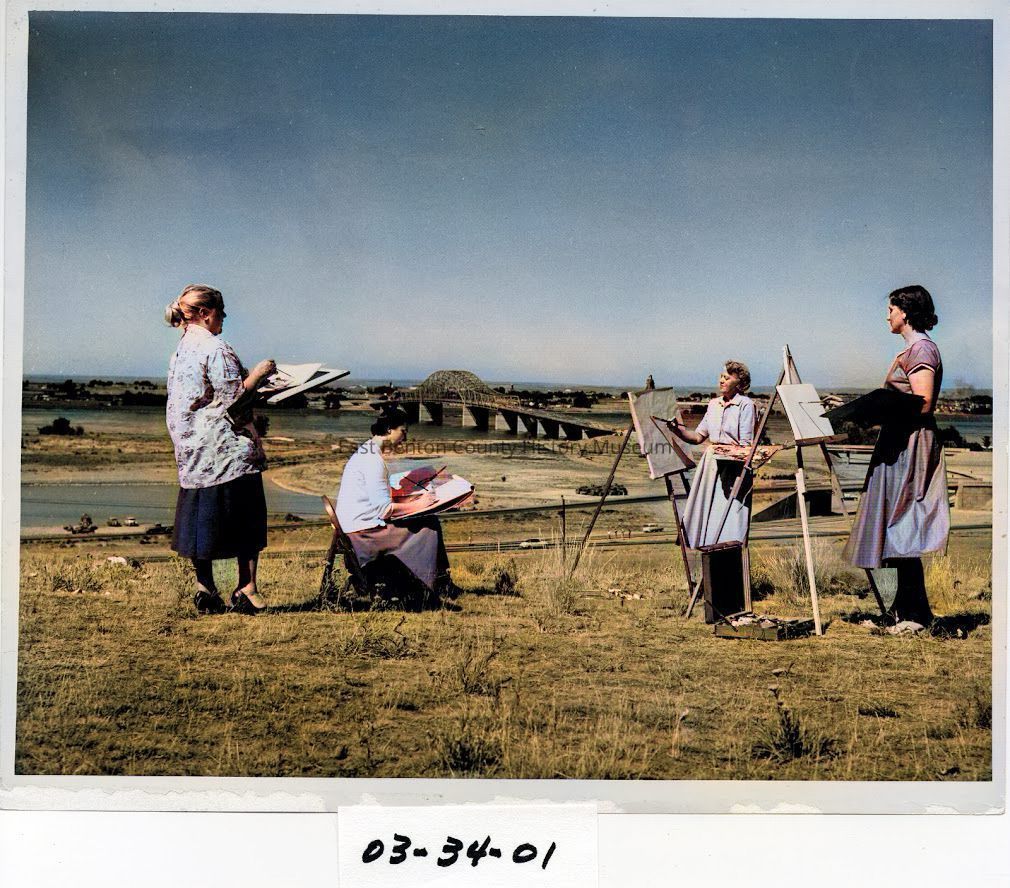 Four Women Painting the Blue Bridge from the Pasco side. Just before its completion. Only one identified is third from leftt Mrs. Alvin Cheney.Tags