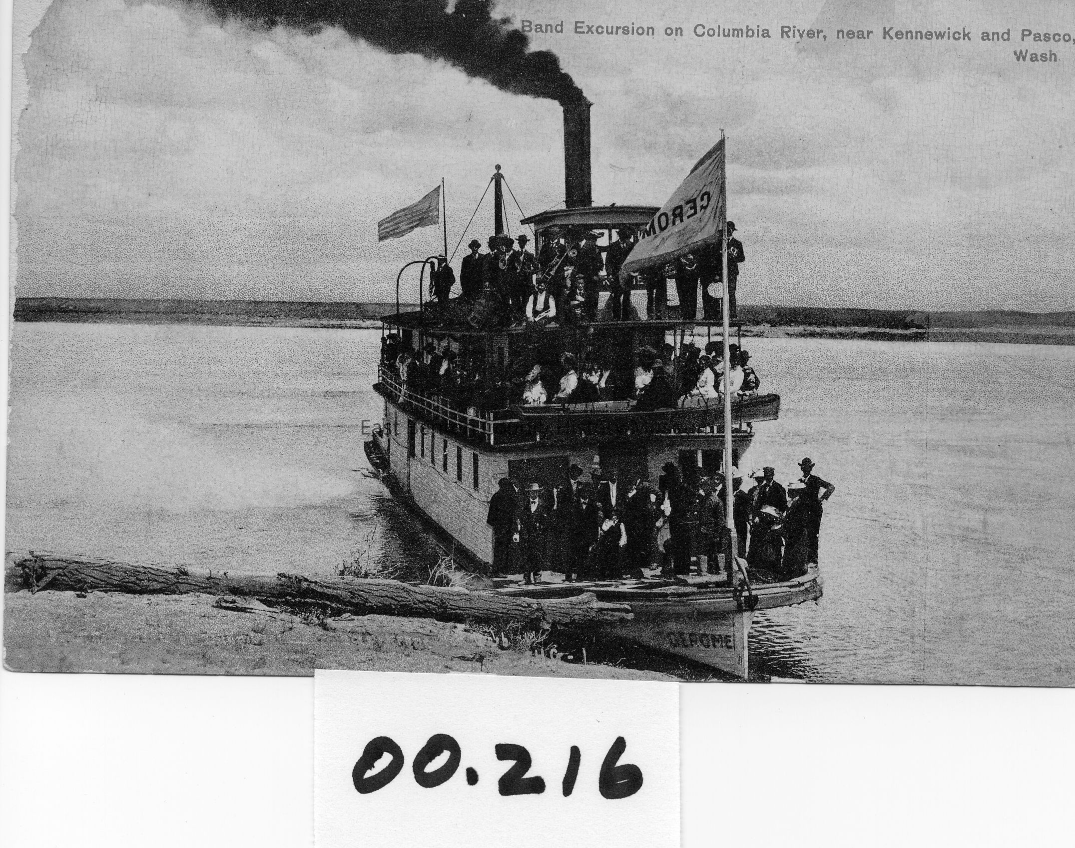 Gerome, loaded with passengers at river shore. Caption reads "Band Excursion on the Columbia River near Kennewick and Pasco."Tags