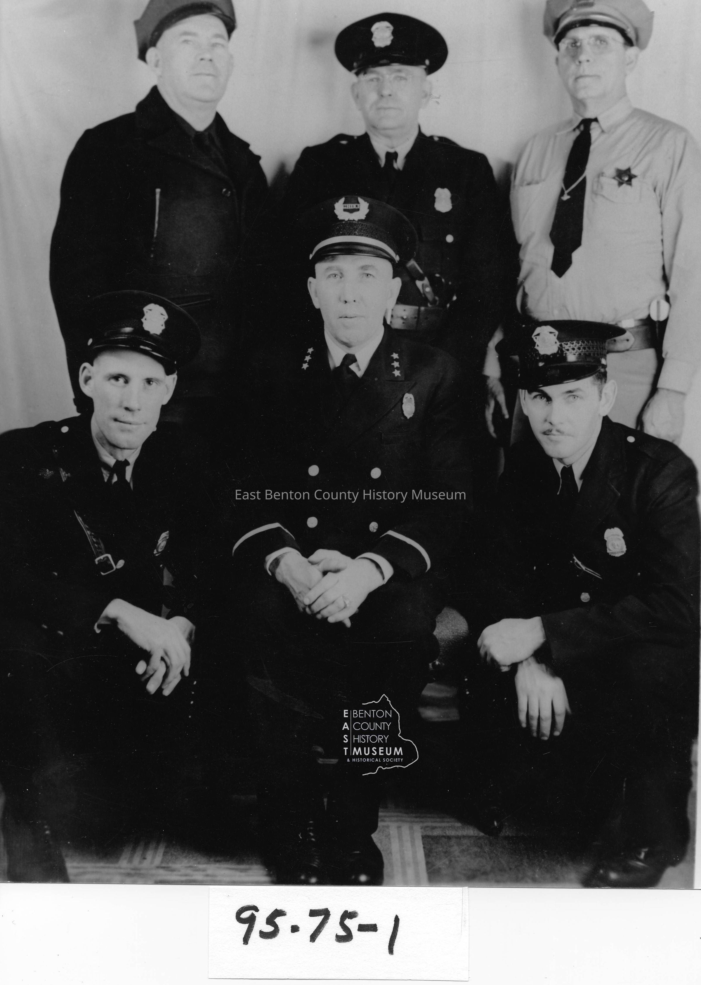 Kennewick Police Department Officers identified on back of photo. Picture taken at end of WWII, probably about 1945. In uniform bottom row: (left to right) John Dickinson, Mitch Kershaw, Ward Rupp. Top Row: Walt Billingsley, William Foraker, Ted PersingerTags