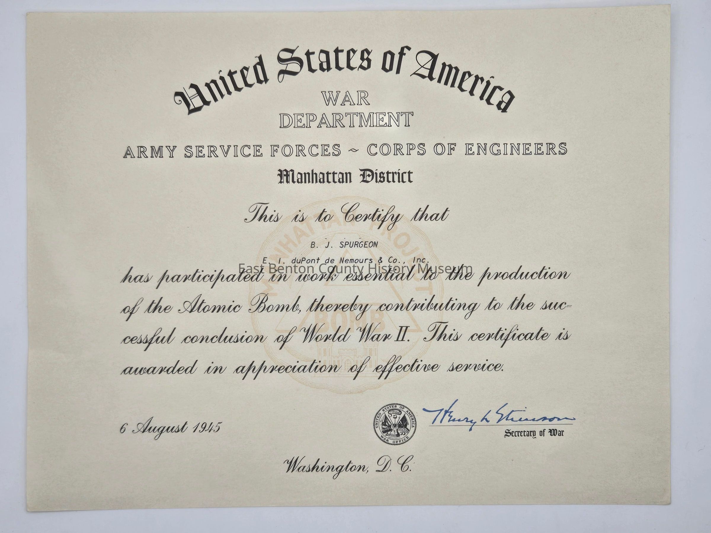 Manhattan Project certificate