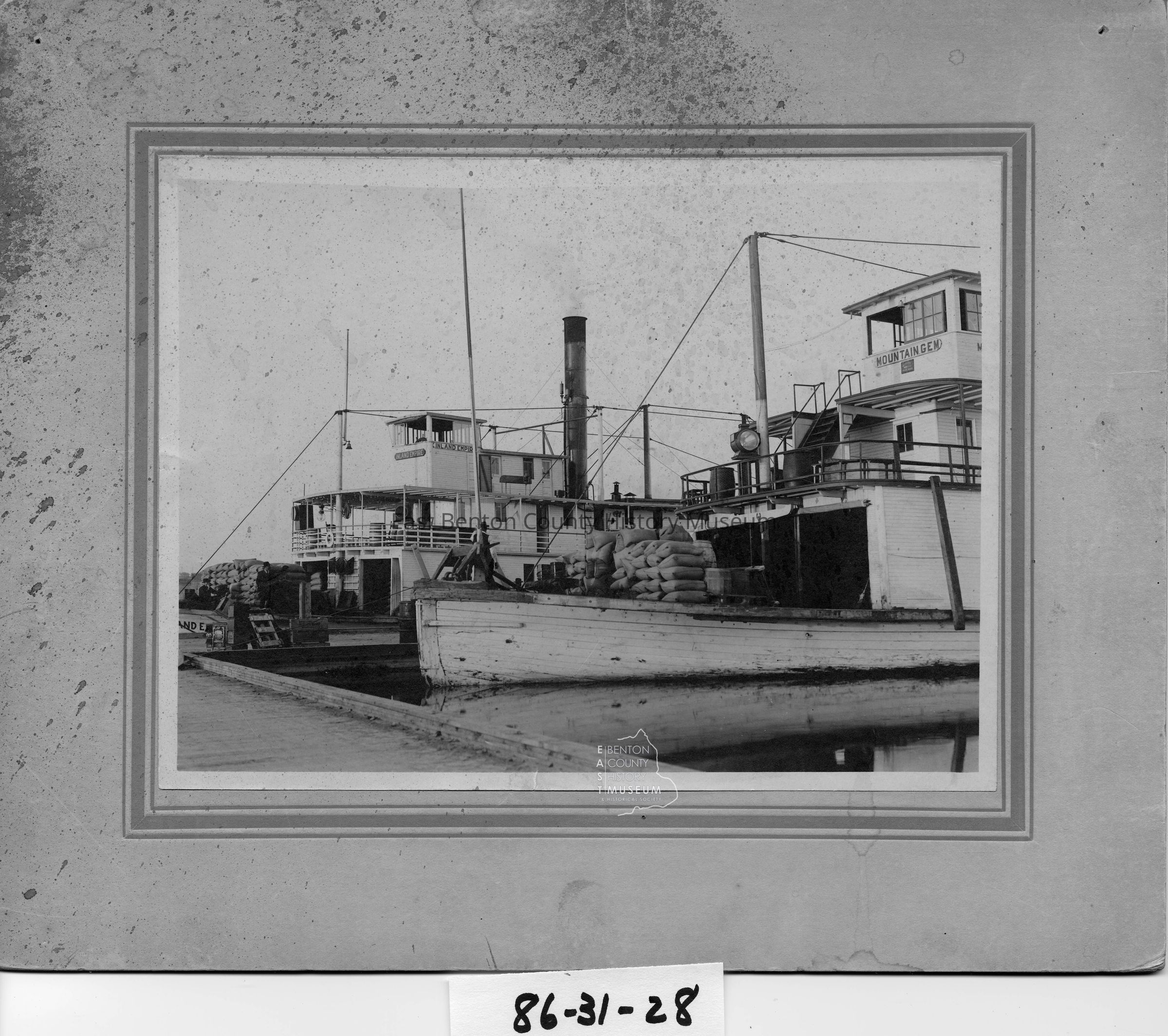Mountain Gem, Inland Empire tied up to dock. Both are loaded with sacks of grain. 4 men No ID's.
