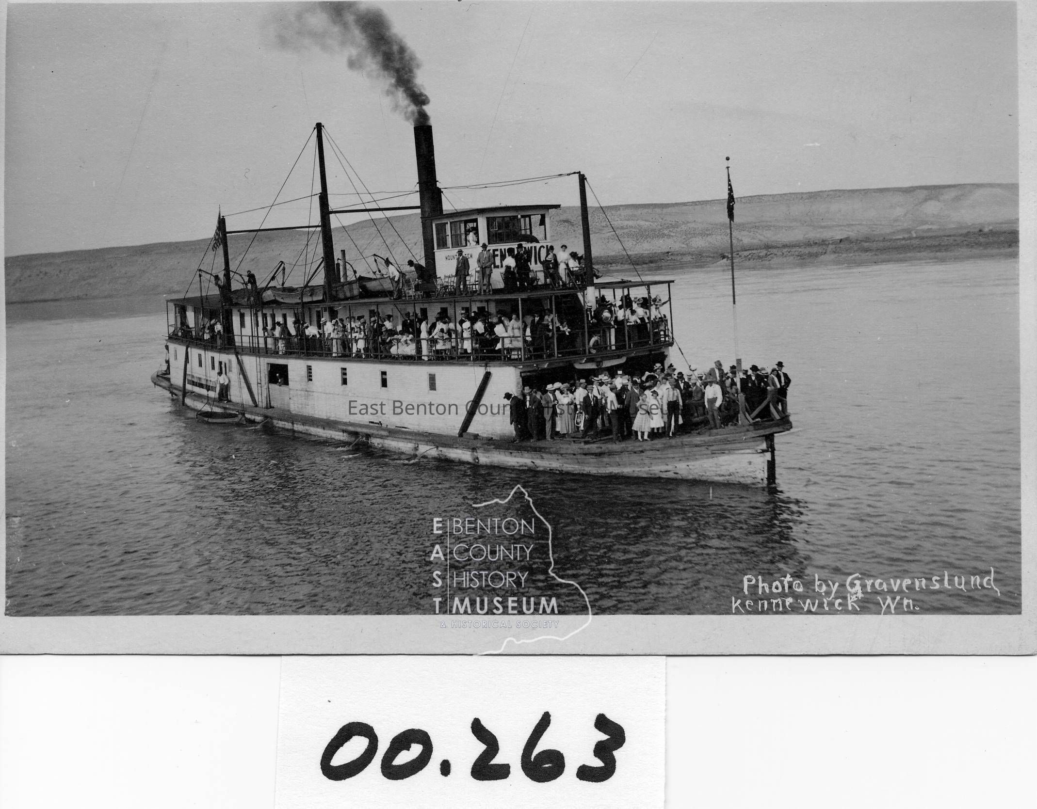 Mountain Gem loaded with passengers from the Commercial Club's excursion from Kennewick to the upriver town on August 10, 1911, See also Kennewick Courier, 8/11 and 8/18/1911,