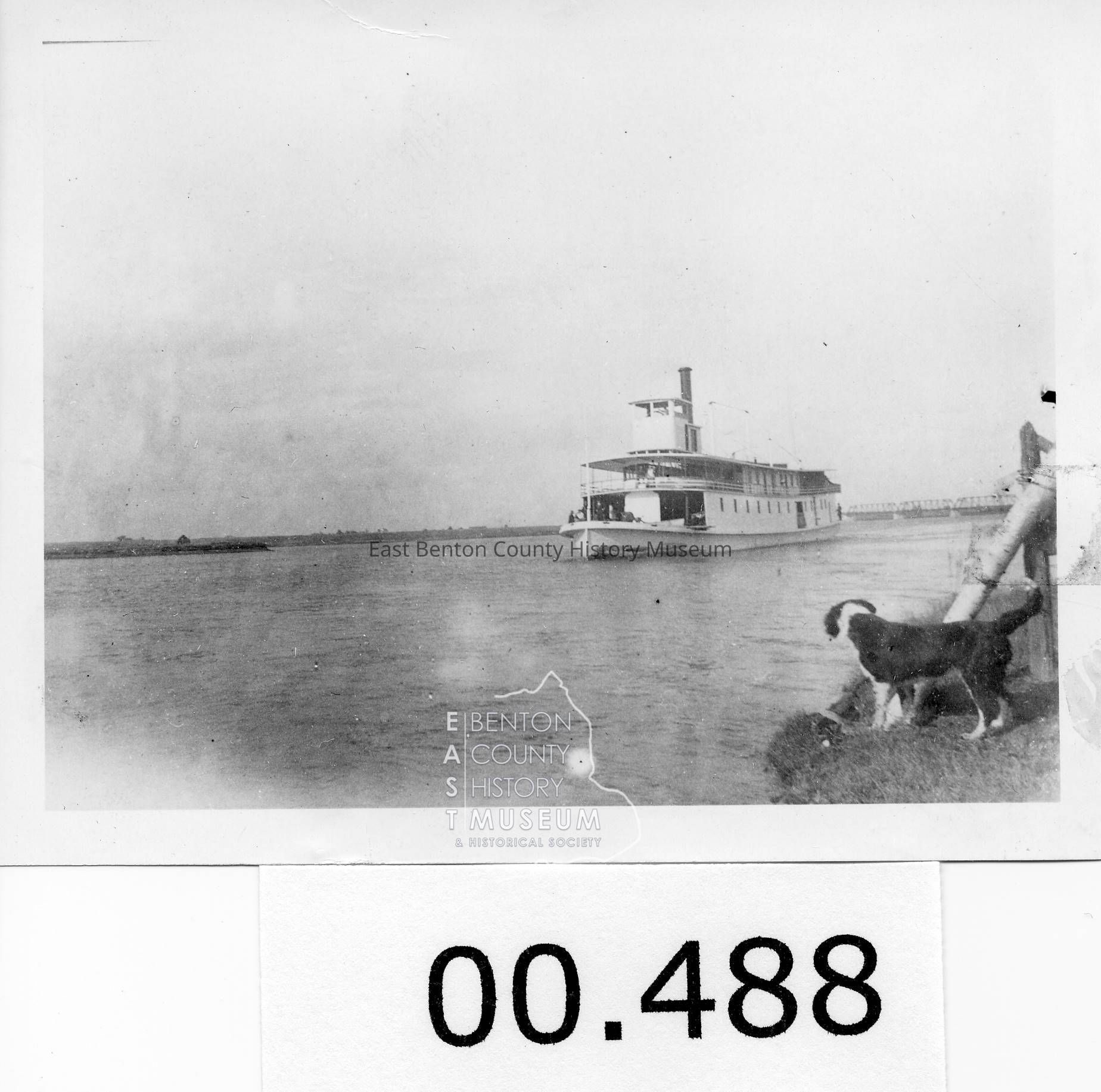 Sternwheel Steamboat Ferry. No Identification. Shows bridge in background. Dog and fence along shore.Tags