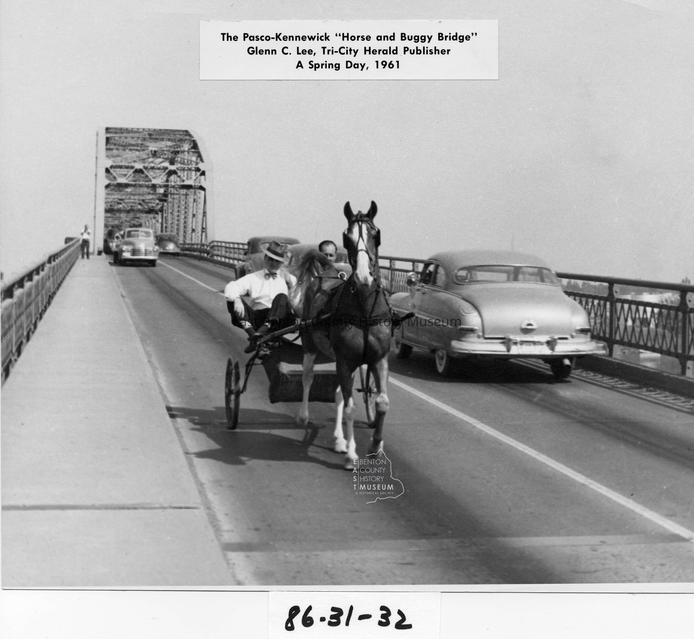 The Pasco, Kennewick "Horse and Buggy Bridge" with Glenn C. Lee, Tri-City Herlad Publisher, the Driver is unkown.Tags