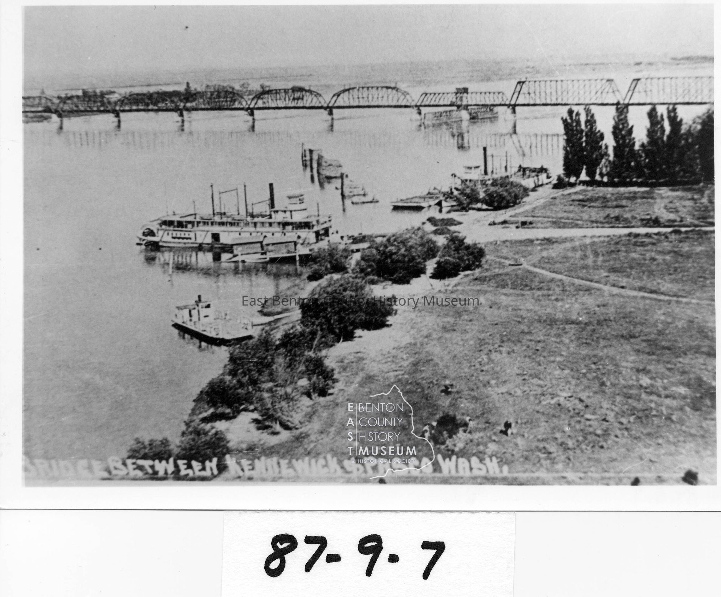 Two unidentified sternwheelers and a ferry at the Kennewick docks railroad bridge in backgrouindTags