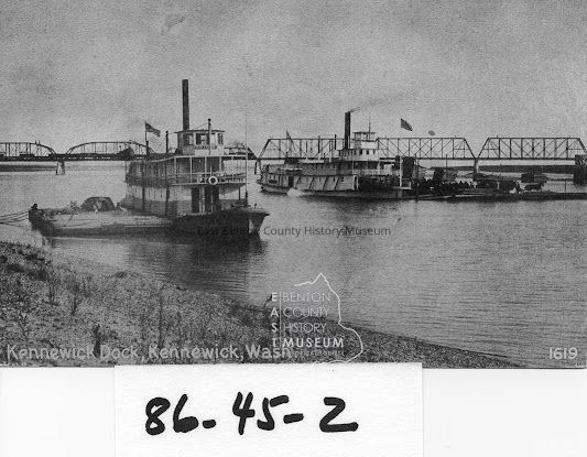 W.R. Todd, and two Steamboats at the Kennewick Dock. Railroad bridge and train in background.Tags