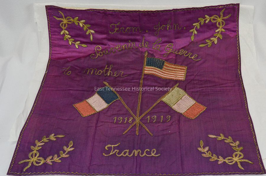 WWI French souvenir pillow (case?) purchased in France by John G. Peck, marked "From John/ Souvenir de la Guerre*/ To Mother/ 1918 1919/ France," French/American/? flags at center, embroidered laurel wreath in white in each corner, c. 1919.