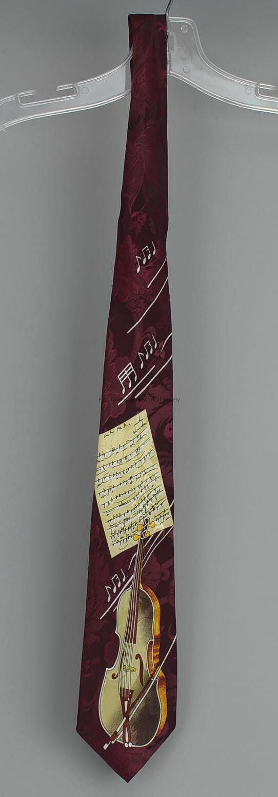 Neck tie worn on stage by Charles Edward "Charlie" Collins, light-weight maroon woven damask polyester, sheet music/musical notes/fiddle design in shades of white/gold/yellow/brown/black, fully lined in dark-blue polyester solid, "Designs by A. Rogers" label on reverse, manufactered by Designer Silk House (Korea), 56"l x 4"w, c. 2010.Made/Created